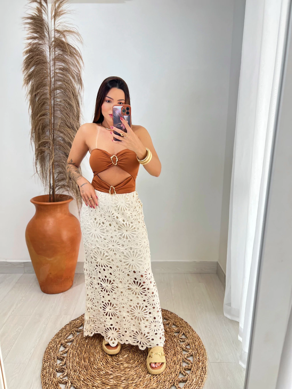 recortes frontais com detalhes de fivela orgânica