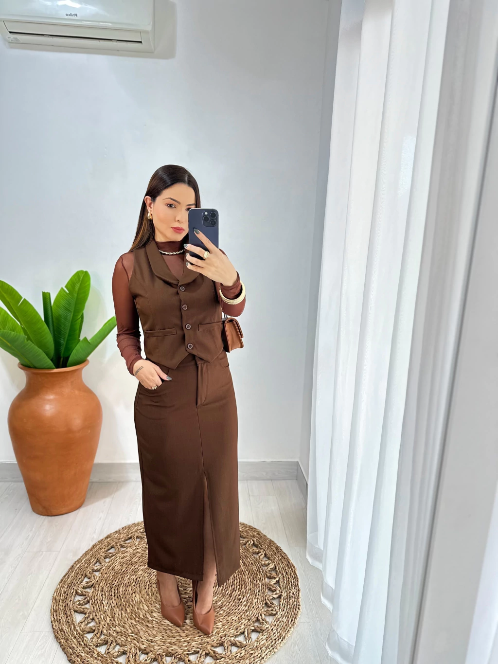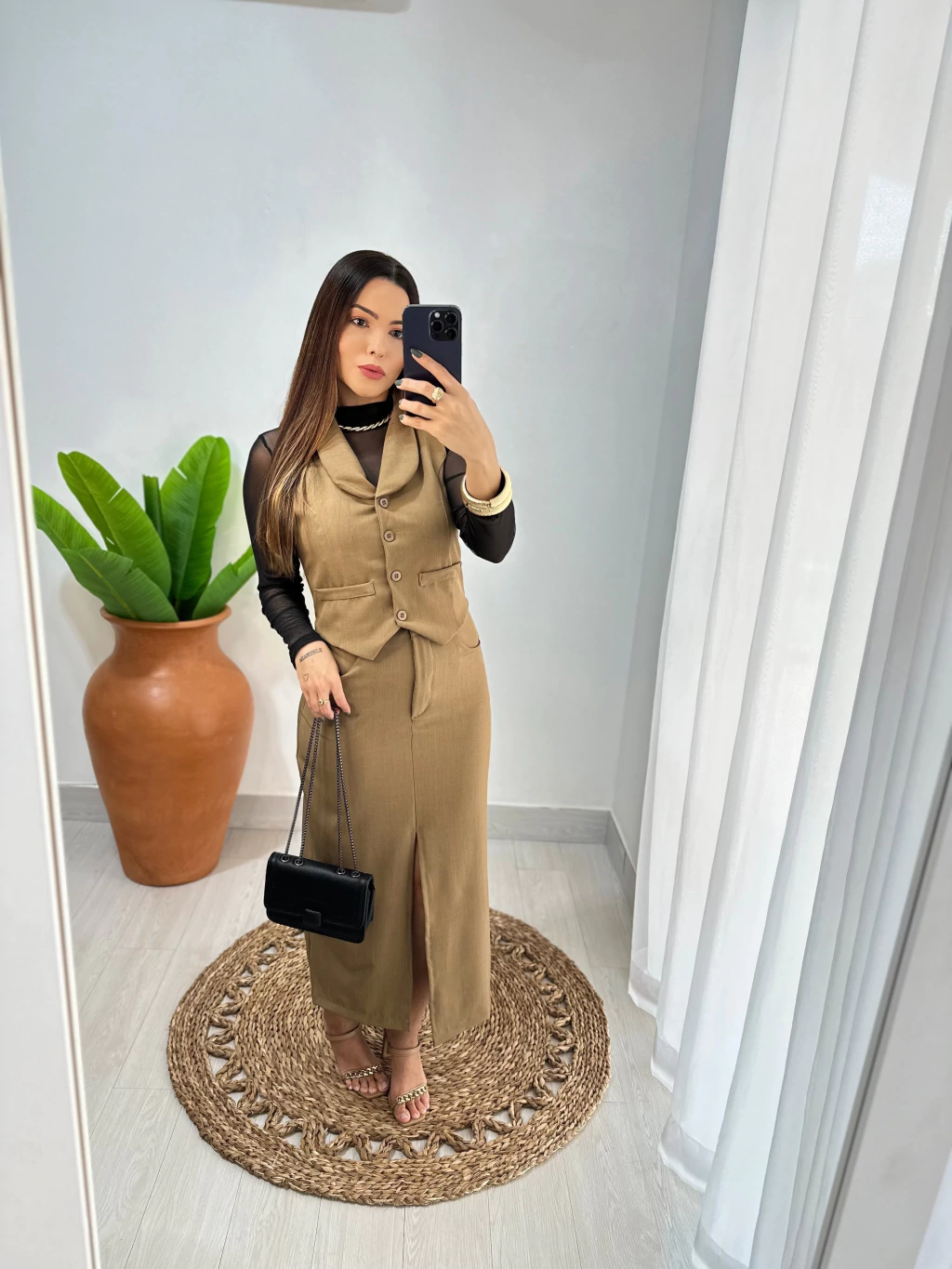 Esse look é composto por saia midi com fenda frontal + colete estruturado, feito em tecido encorpado que modela o corpo com elegância. A proposta é perfeita para quem busca um visual moderno, versátil e super alinhado às tendências da temporada. Combine com blusa de tule por baixo para um toque fashion irresistível.