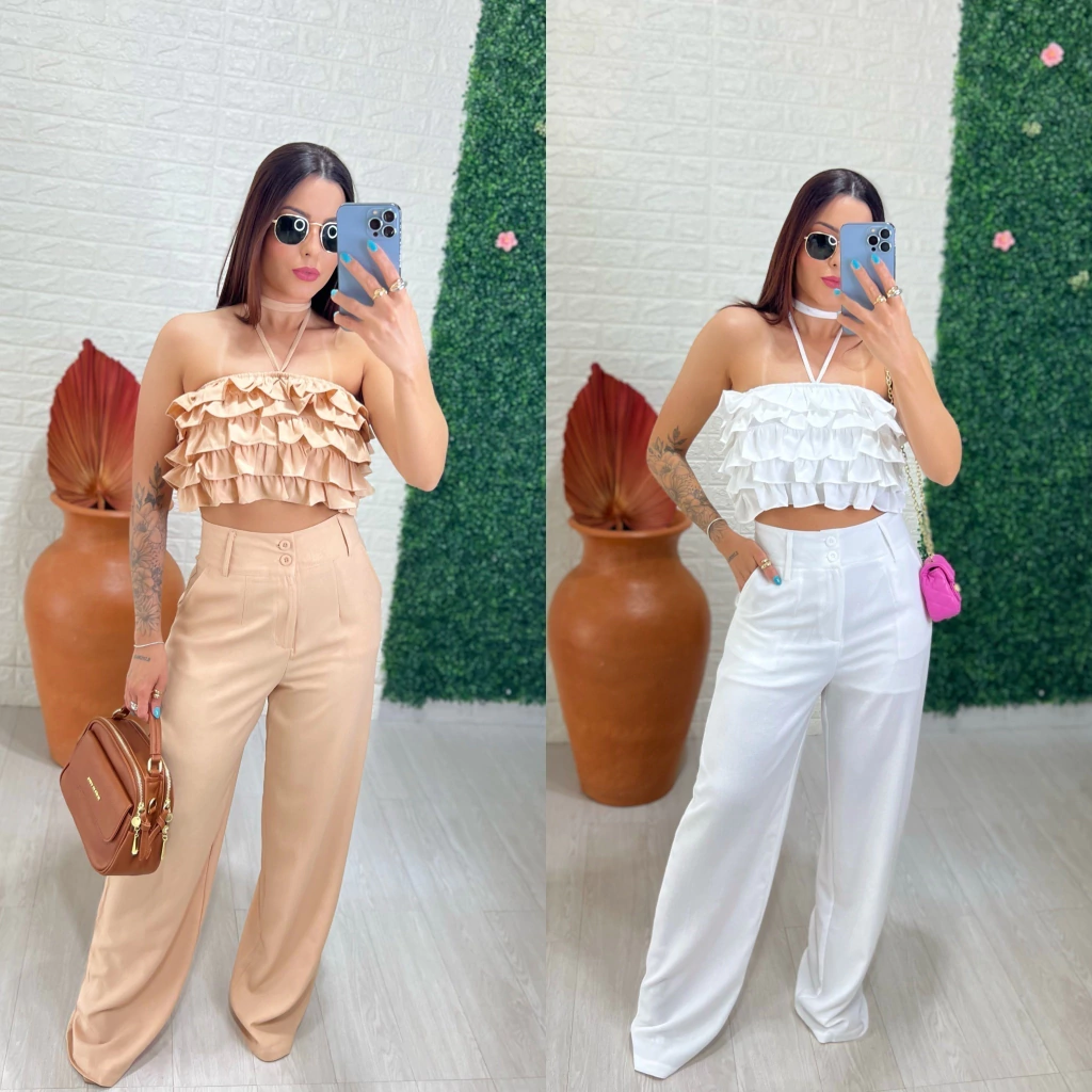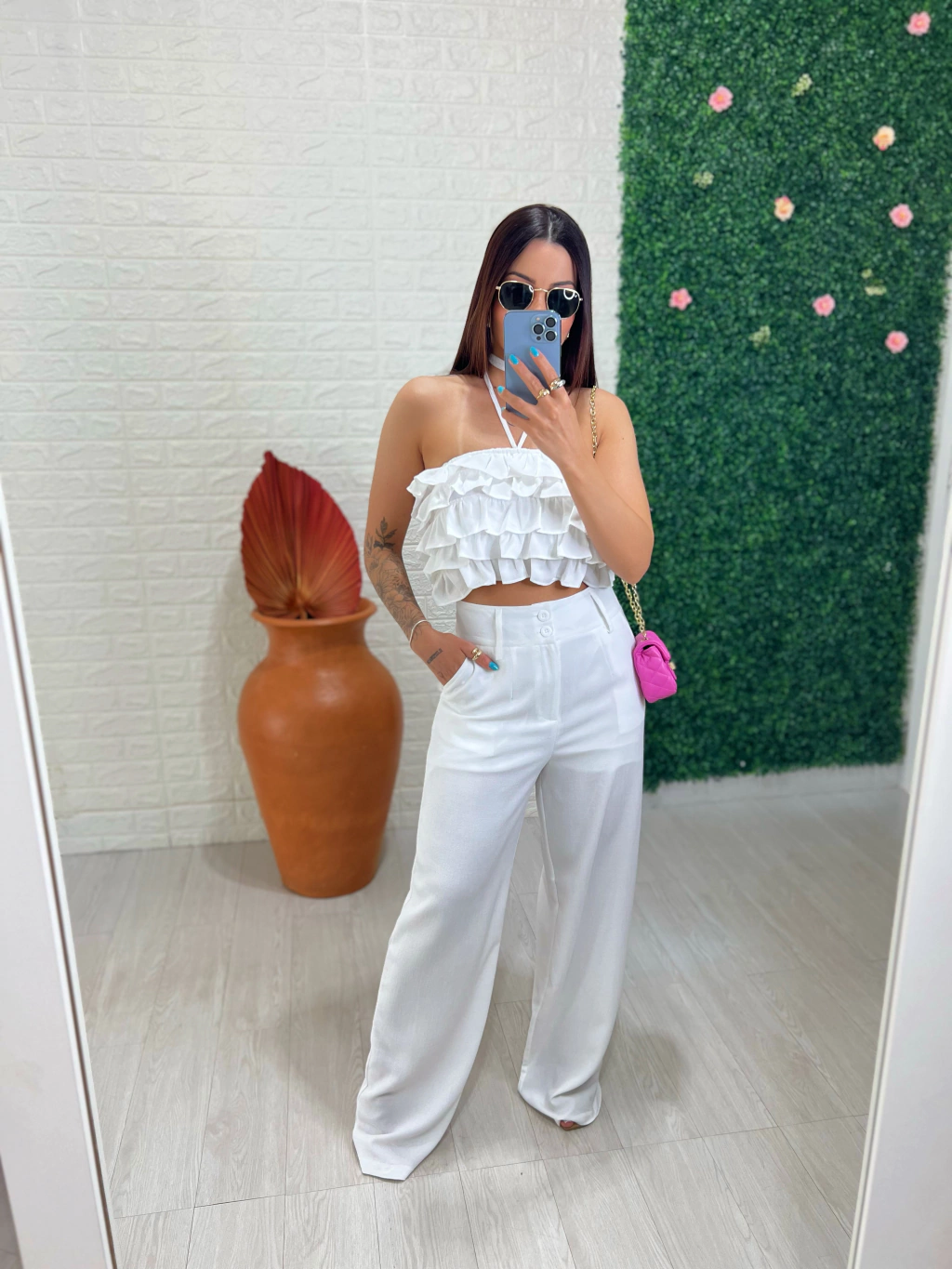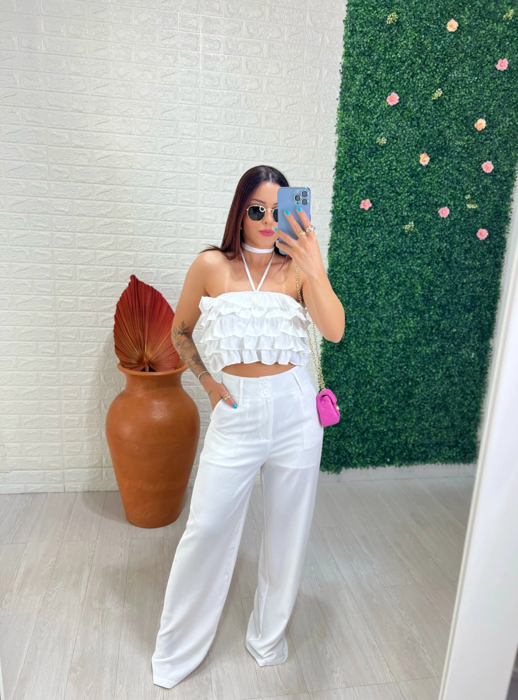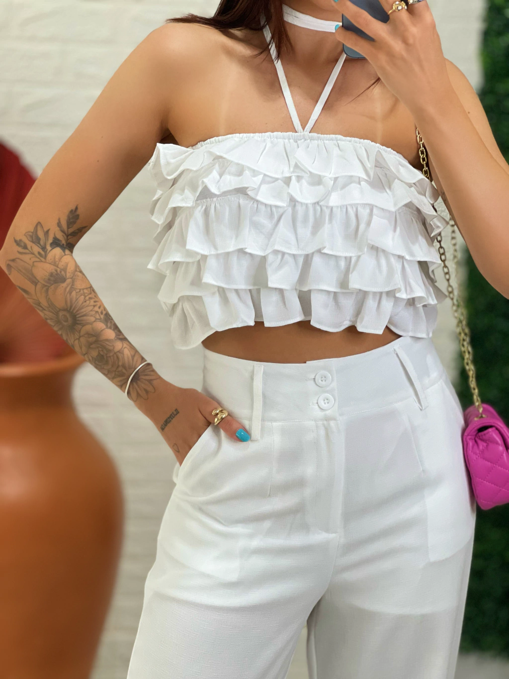 cropped ; em babados; com fita de amarração ( podendo usar no pescoço ou por dentro do cropped dando o efeito tomara que caia .)