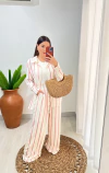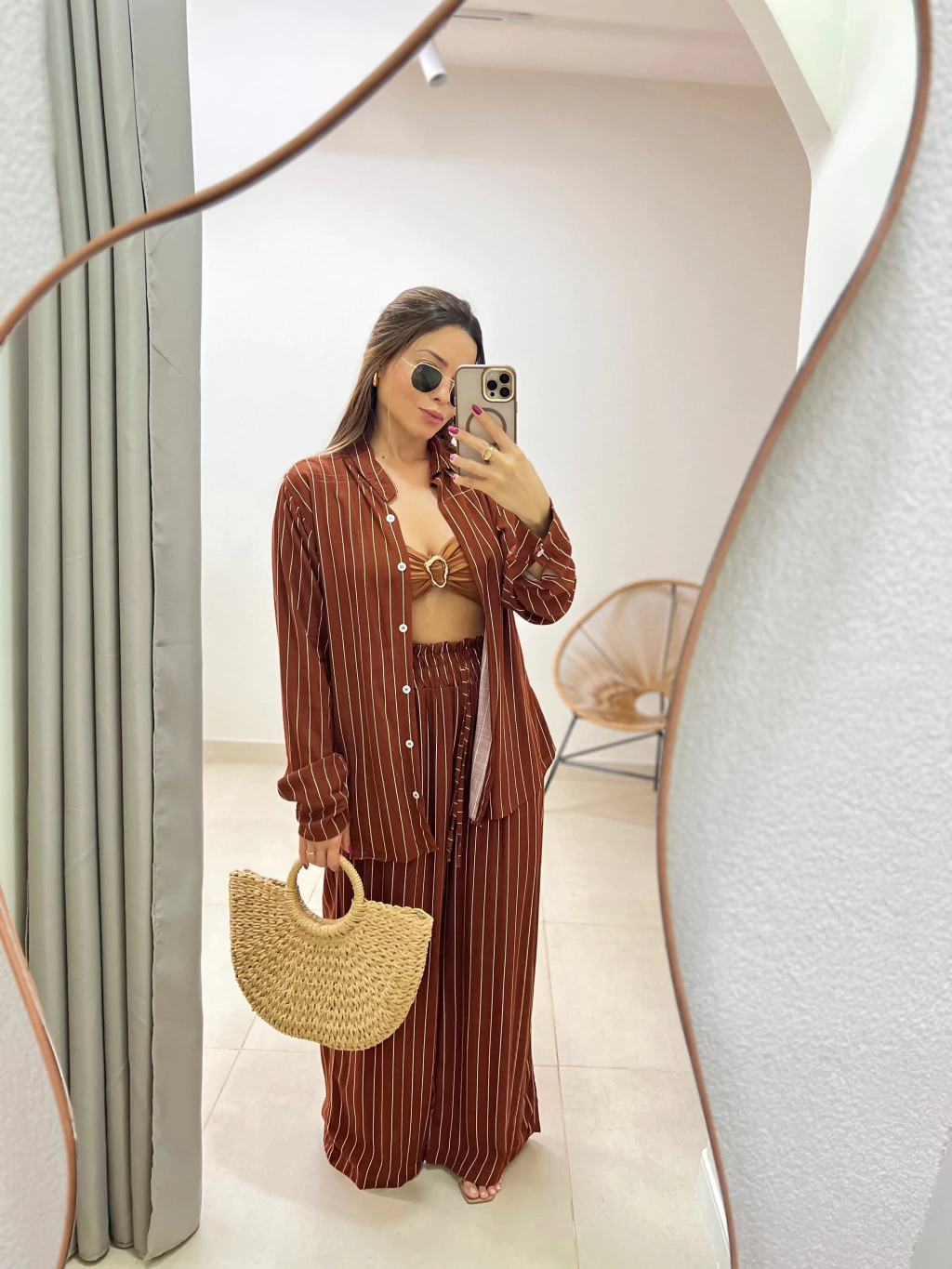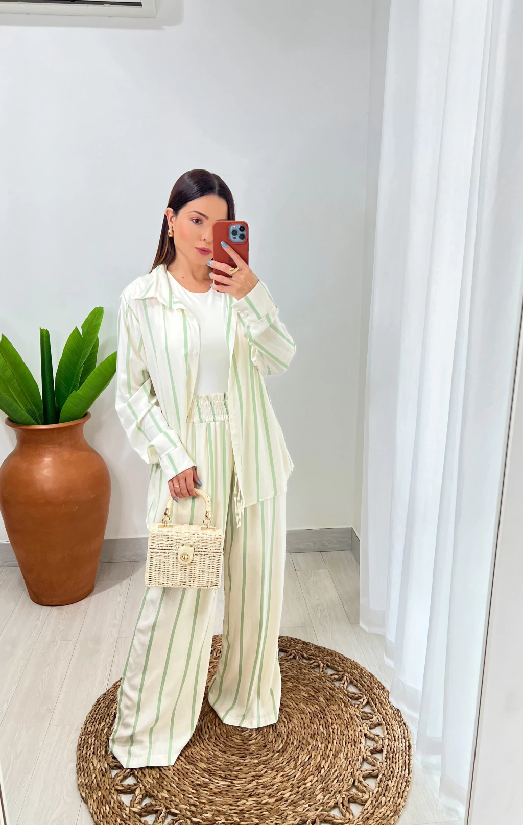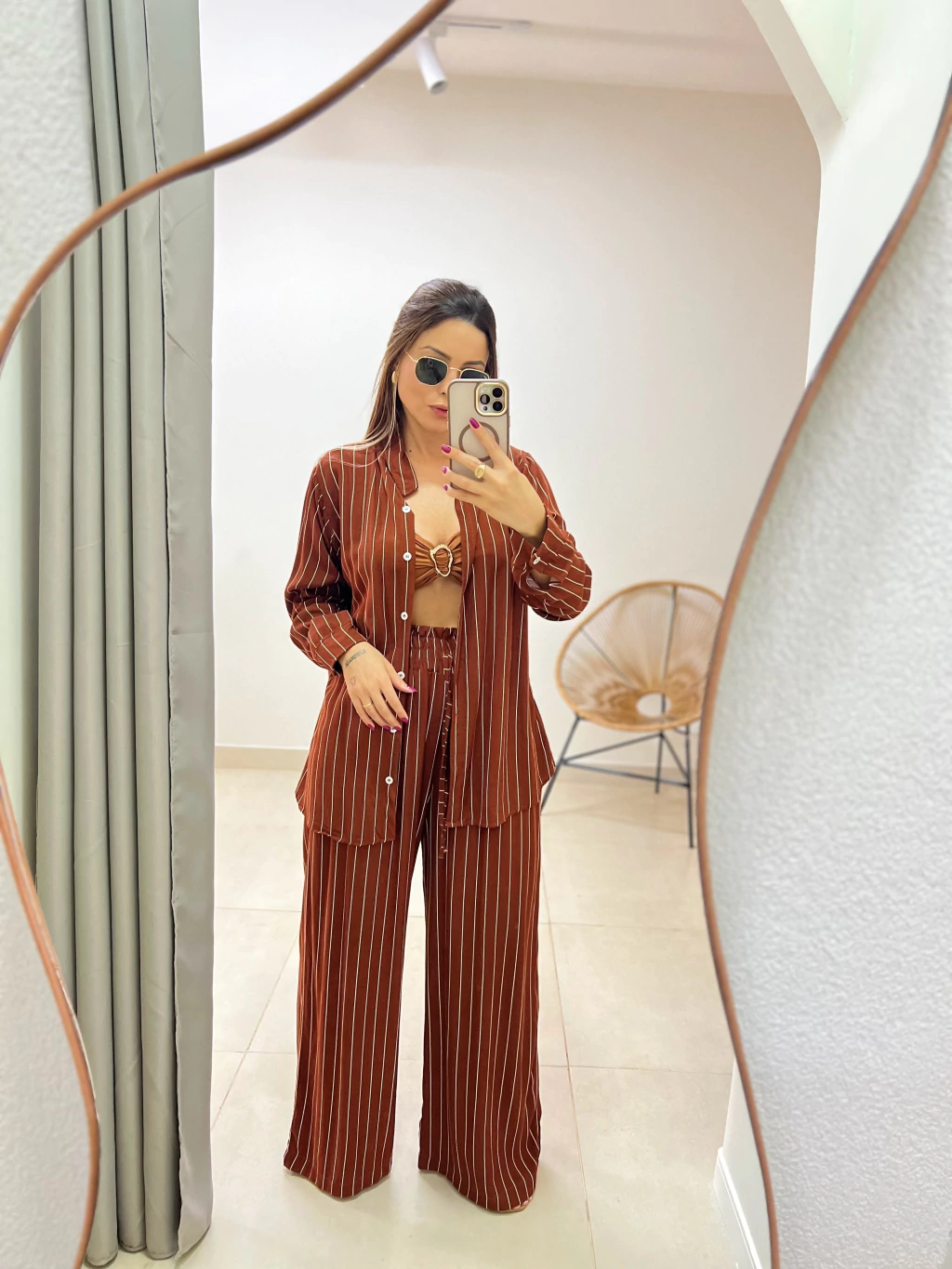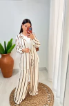 Nosso Conjunto LÍDIA de calça e camisa em tecido leve com caimento fluido, ideal para compor looks elegantes e descomplicados. A estampa de listras verticais adiciona sofisticação e alonga a silhueta.