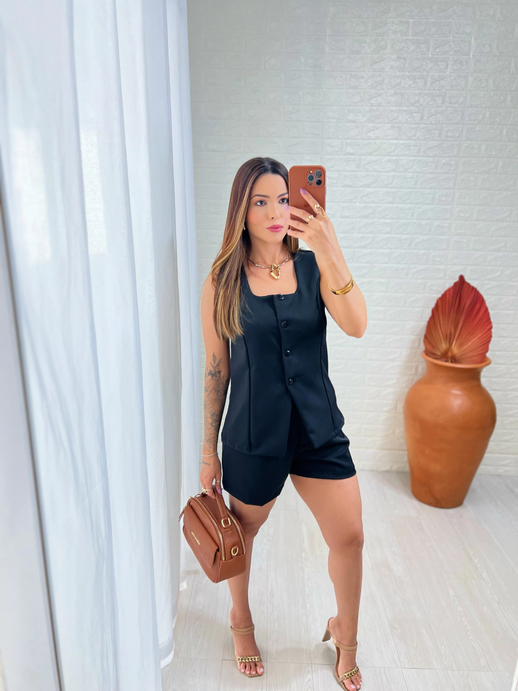 Conheça o Conjunto Priscila, uma escolha perfeita para quem busca elegância e praticidade em um só look. Este conjunto é composto por um colete e um short, ambos confeccionados em tecido alfaiataria, com a seguinte composição: 95% poliéster e 5% elastano, garantindo um caimento impecável e conforto ao longo do dia.