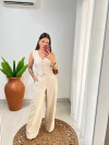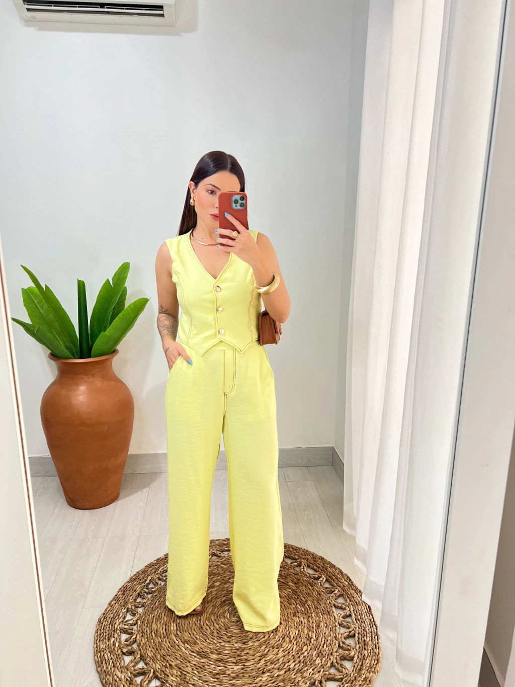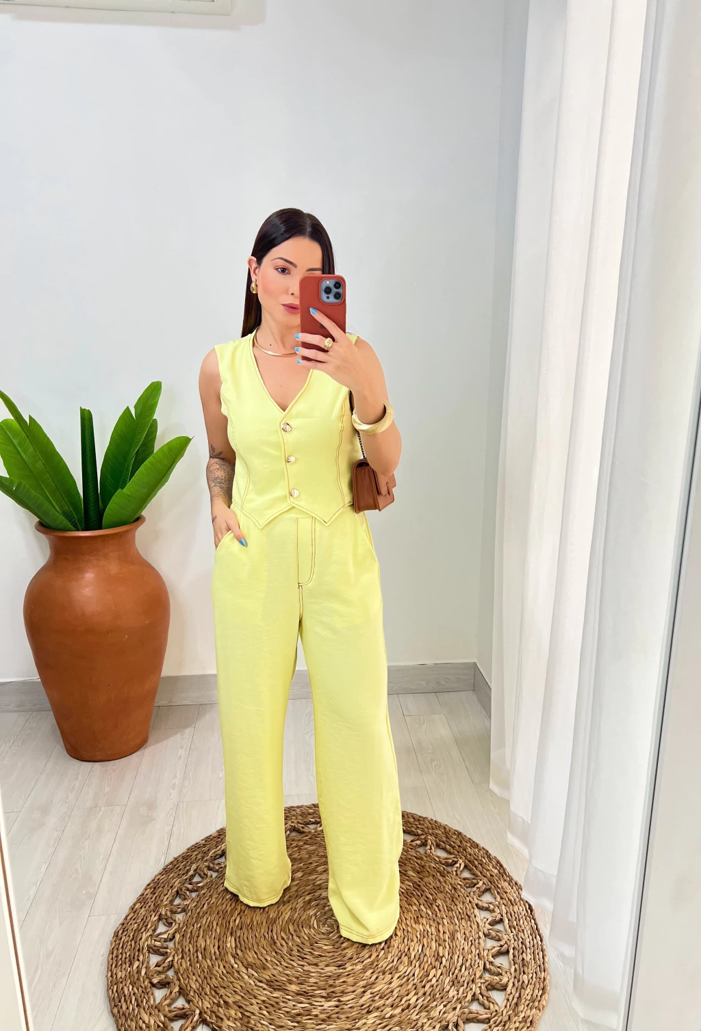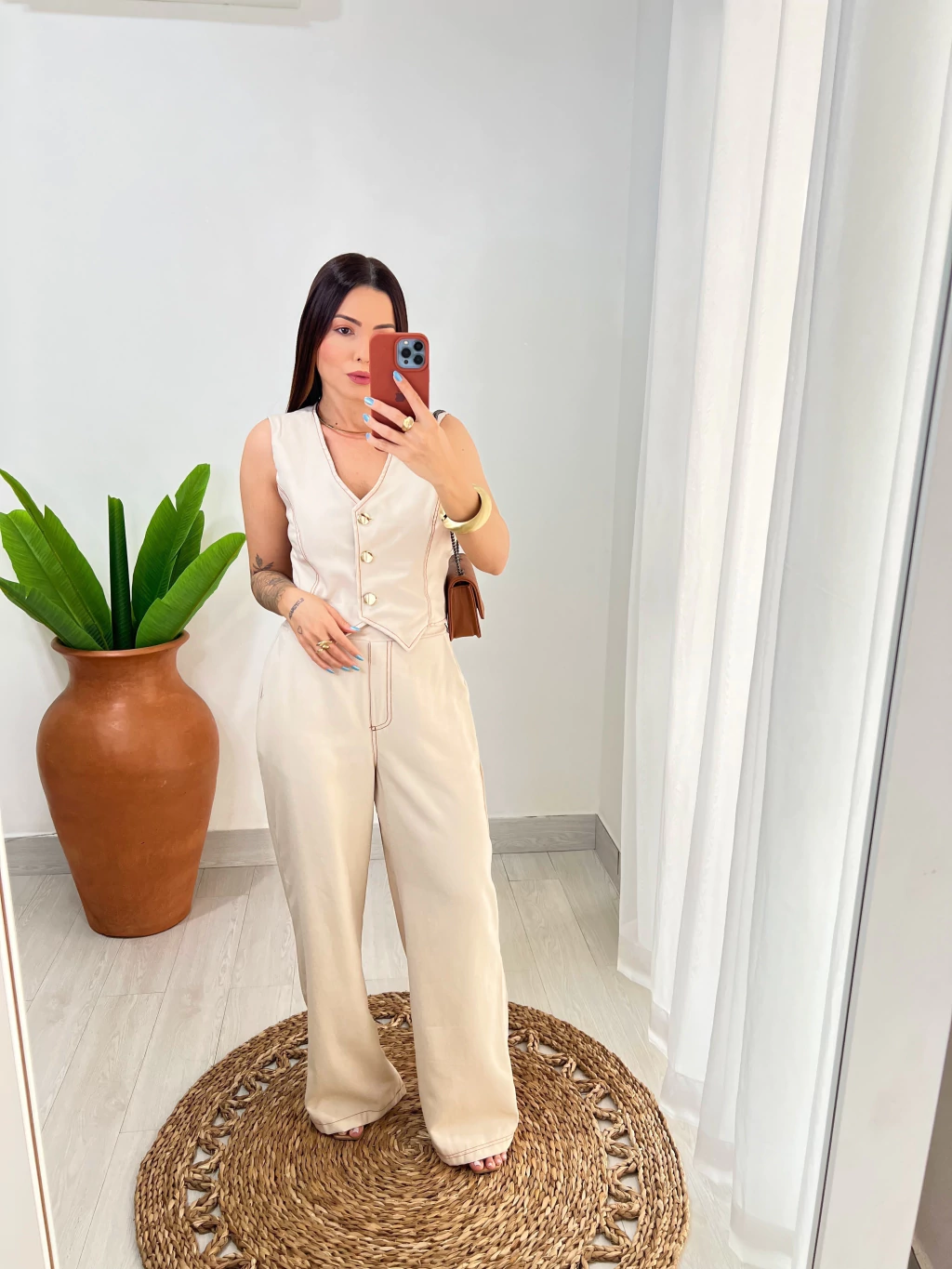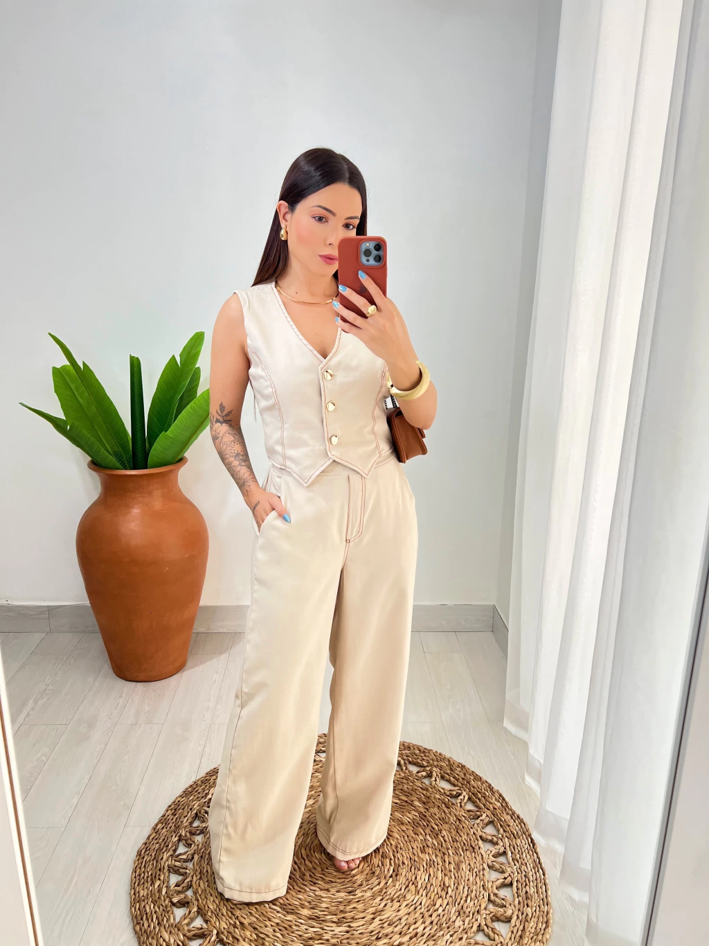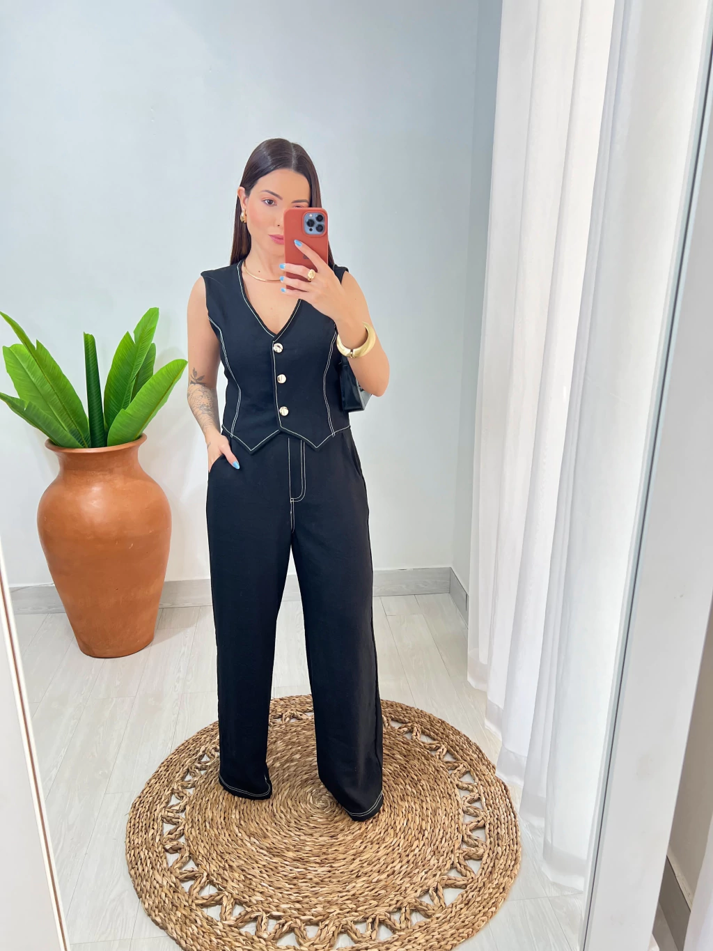 Conjunto Verona moderno e versátil composto por calça pantalona com bolsos laterais e lastex atrás e colete alfaiatado com amarração atrás para ajuste , com fechamento frontal por botões dourados e recortes que valorizam a silhueta. Confeccionado em tecido leve e confortável, oferece caimento impecável e estilo elegante para diversas ocasiões.