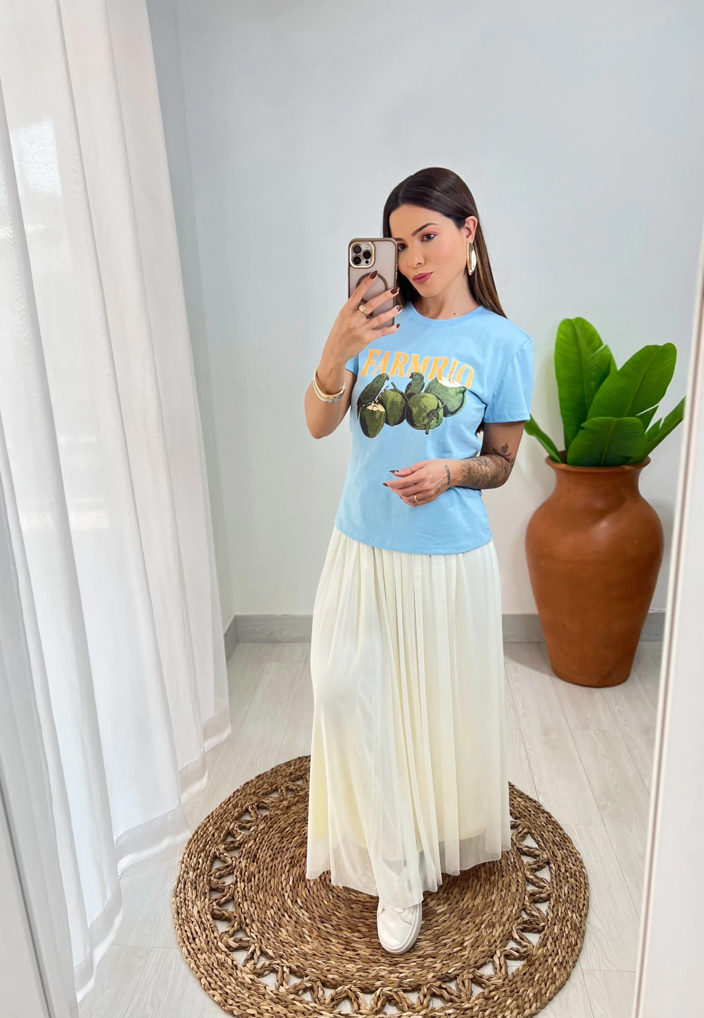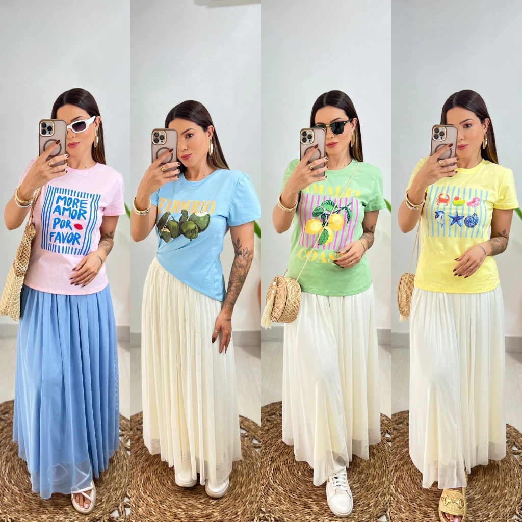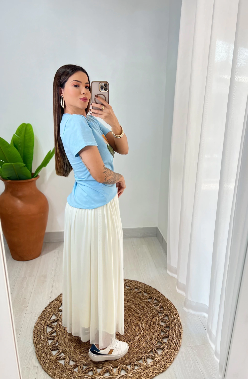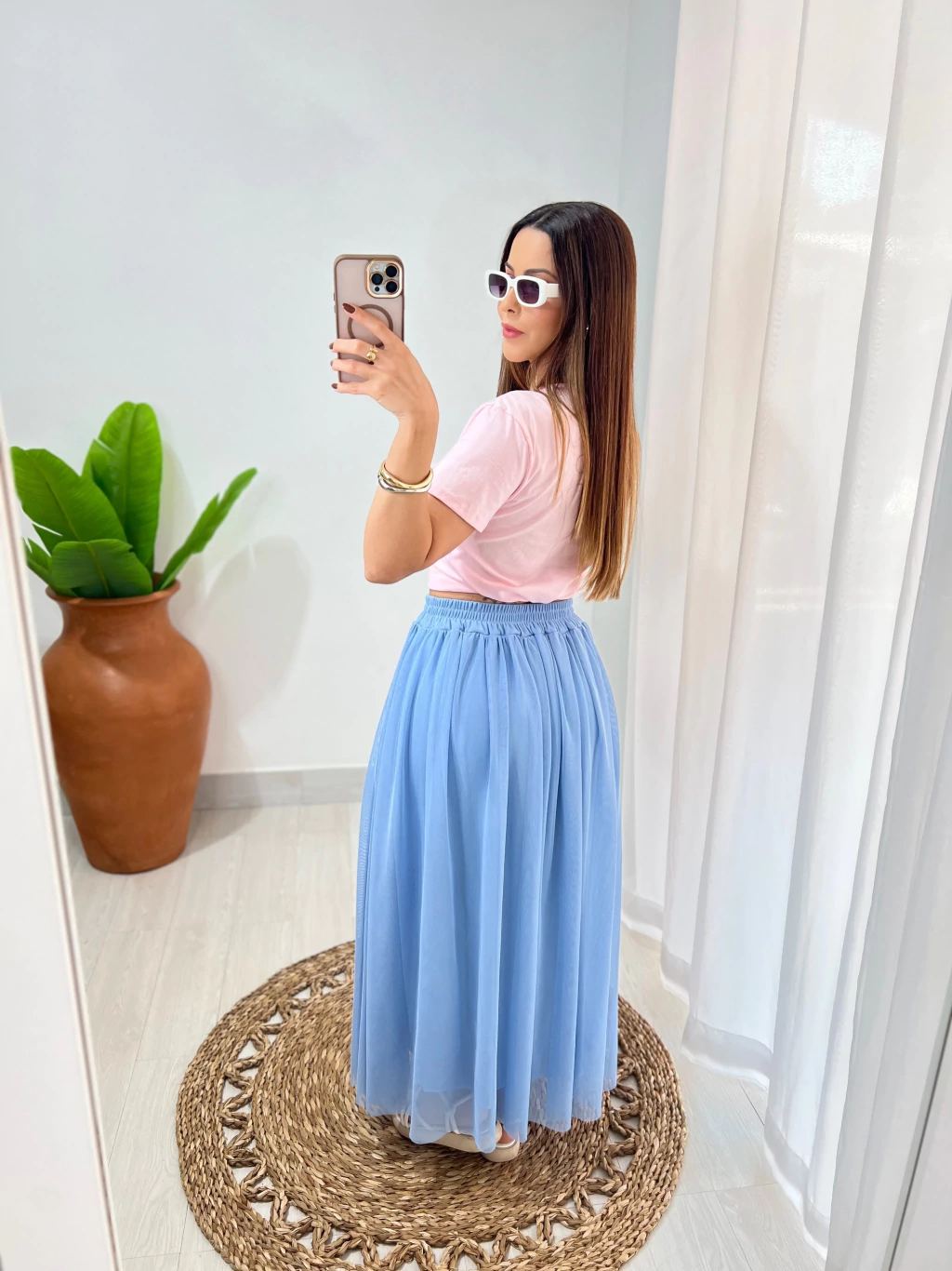 Delicada e feminina, a Saia Jolie encanta com sua leveza e movimento. Confeccionada em tule, ela traz um caimento fluido e romântico, perfeito para compor looks cheios de charme e personalidade.