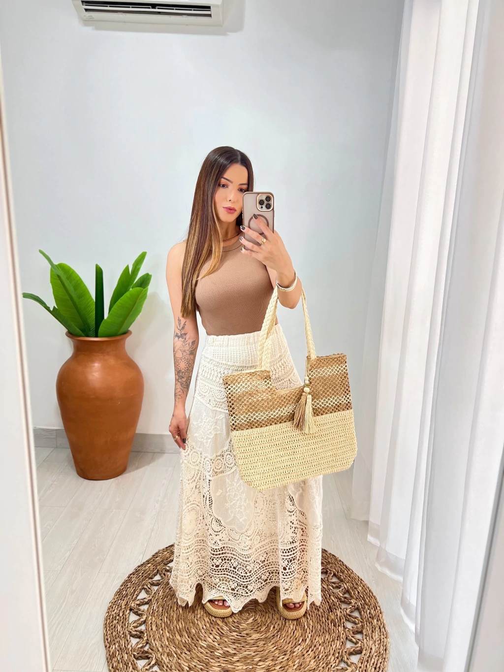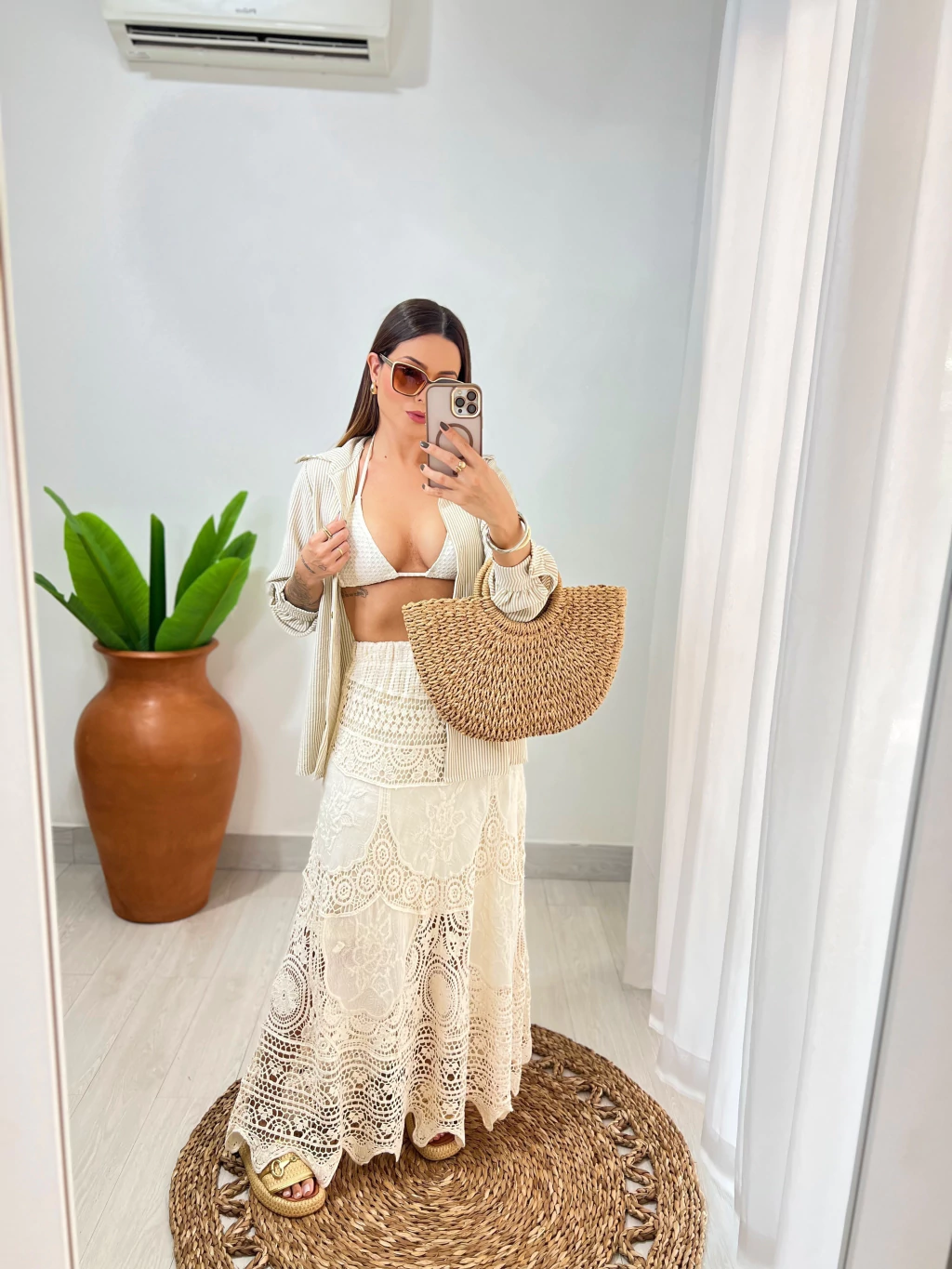 Um clássico atemporal que une delicadeza e estilo. Confeccionada em crochê e renda trabalhada, essa saia longa traz leveza e romantismo para o look. O caimento fluido aliado aos detalhes artesanais cria uma peça sofisticada, perfeita para produções do dia a dia ou ocasiões especiais à beira-mar.