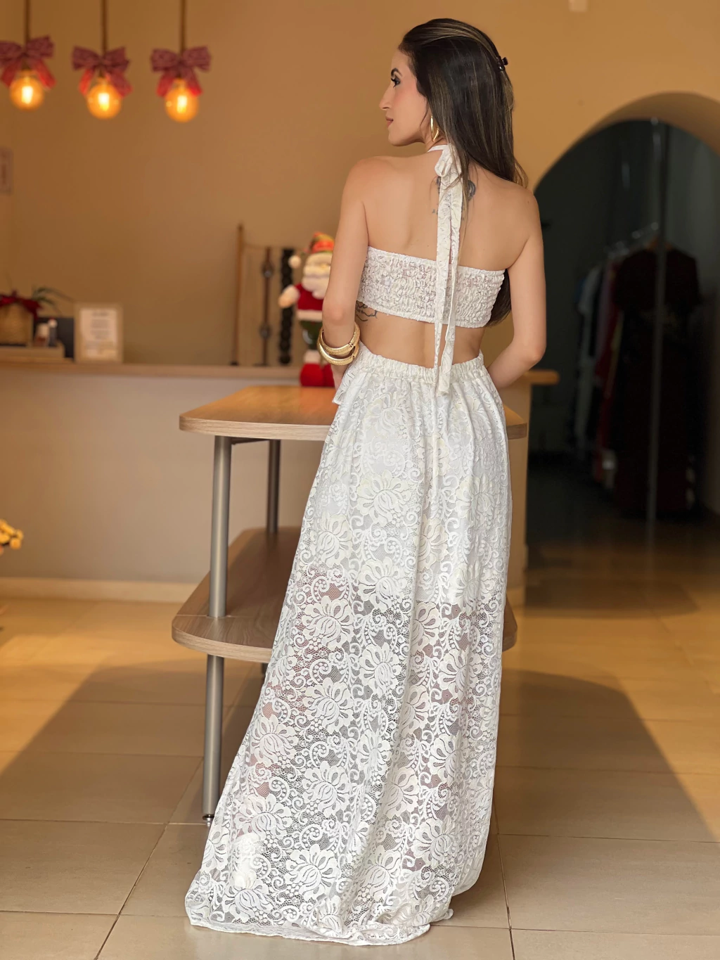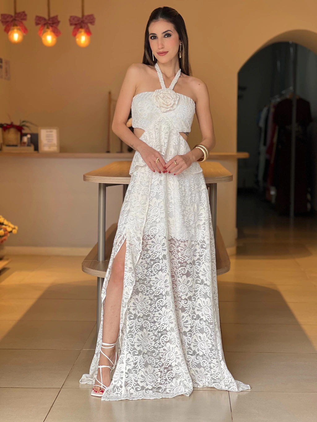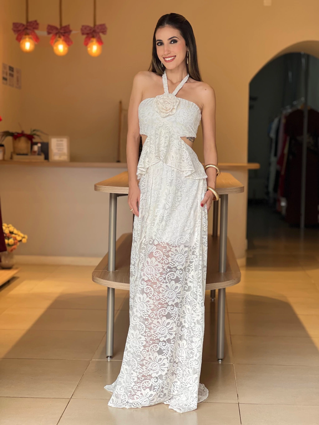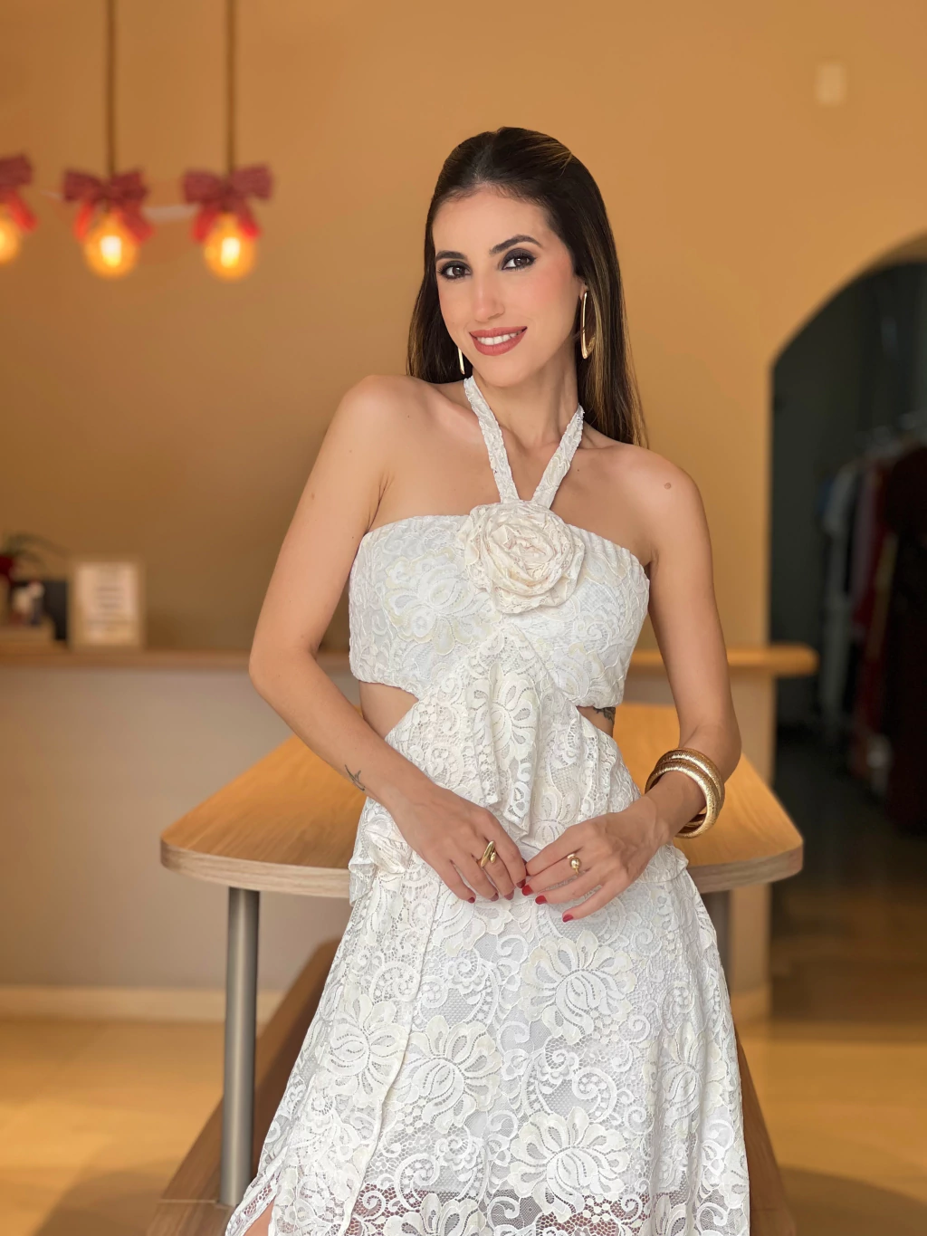 Nosso vestido Brisa é confeccionado em renda trabalhada, ele traz uma textura sofisticada que destaca a delicadeza da peça. O busto com detalhe floral e amarração no pescoço valoriza o colo, enquanto o recorte frontal adiciona modernidade na medida certa.