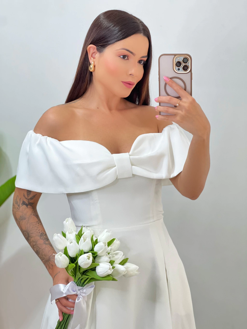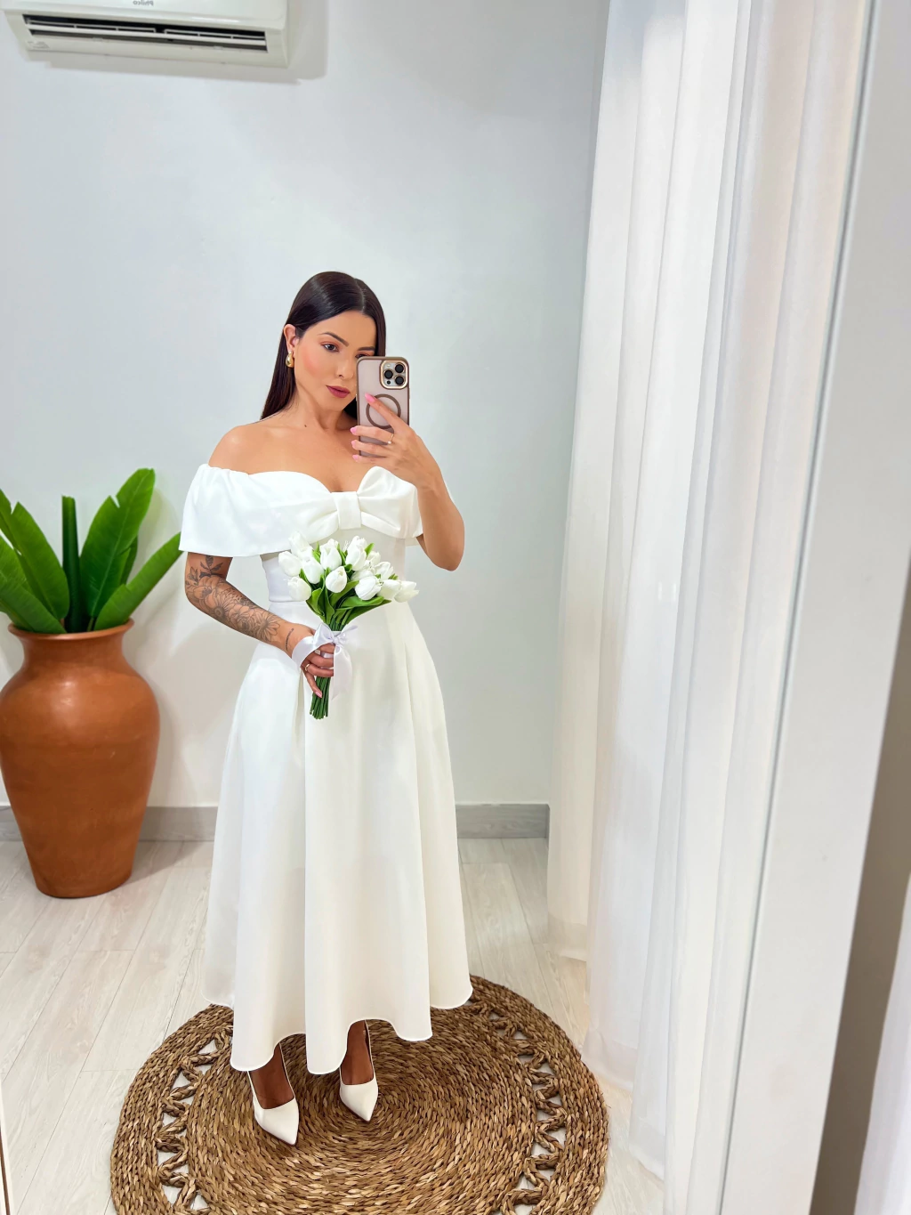 Inspirado na pureza e delicadeza , o Vestido Lírio é romântico e atemporal. Seu modelo tomara que caia com laço frontal valoriza o colo com suavidade, enquanto o comprimento midi garante sofisticação para noivas do civil e ocasiões memoráveis.