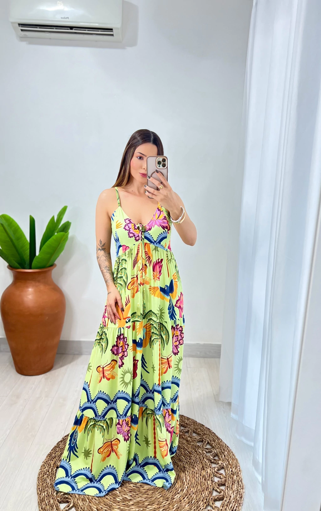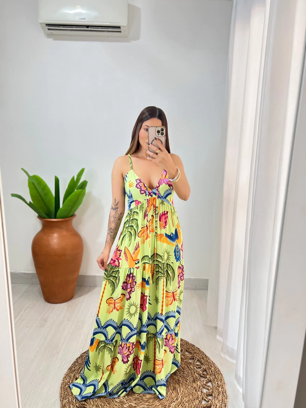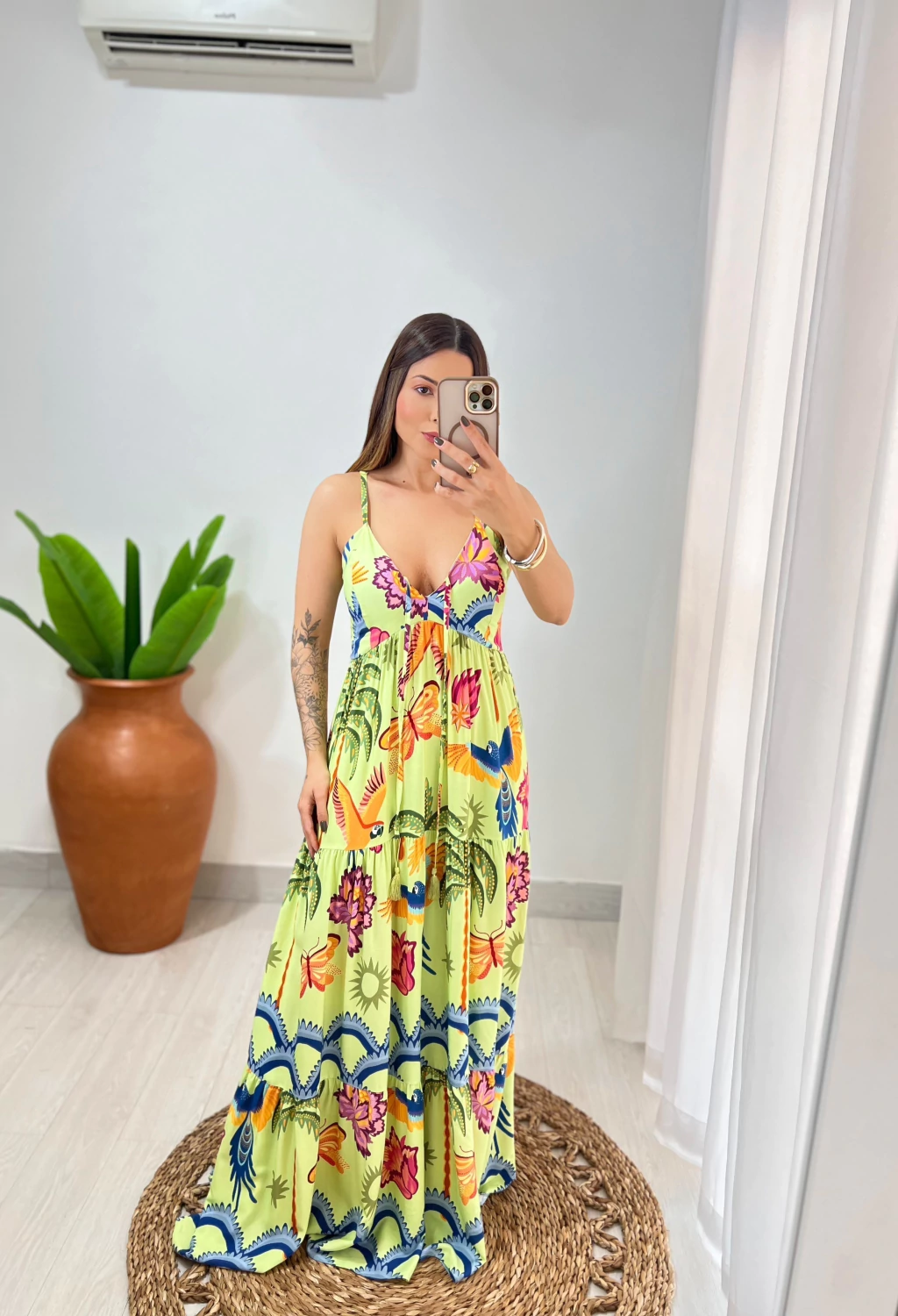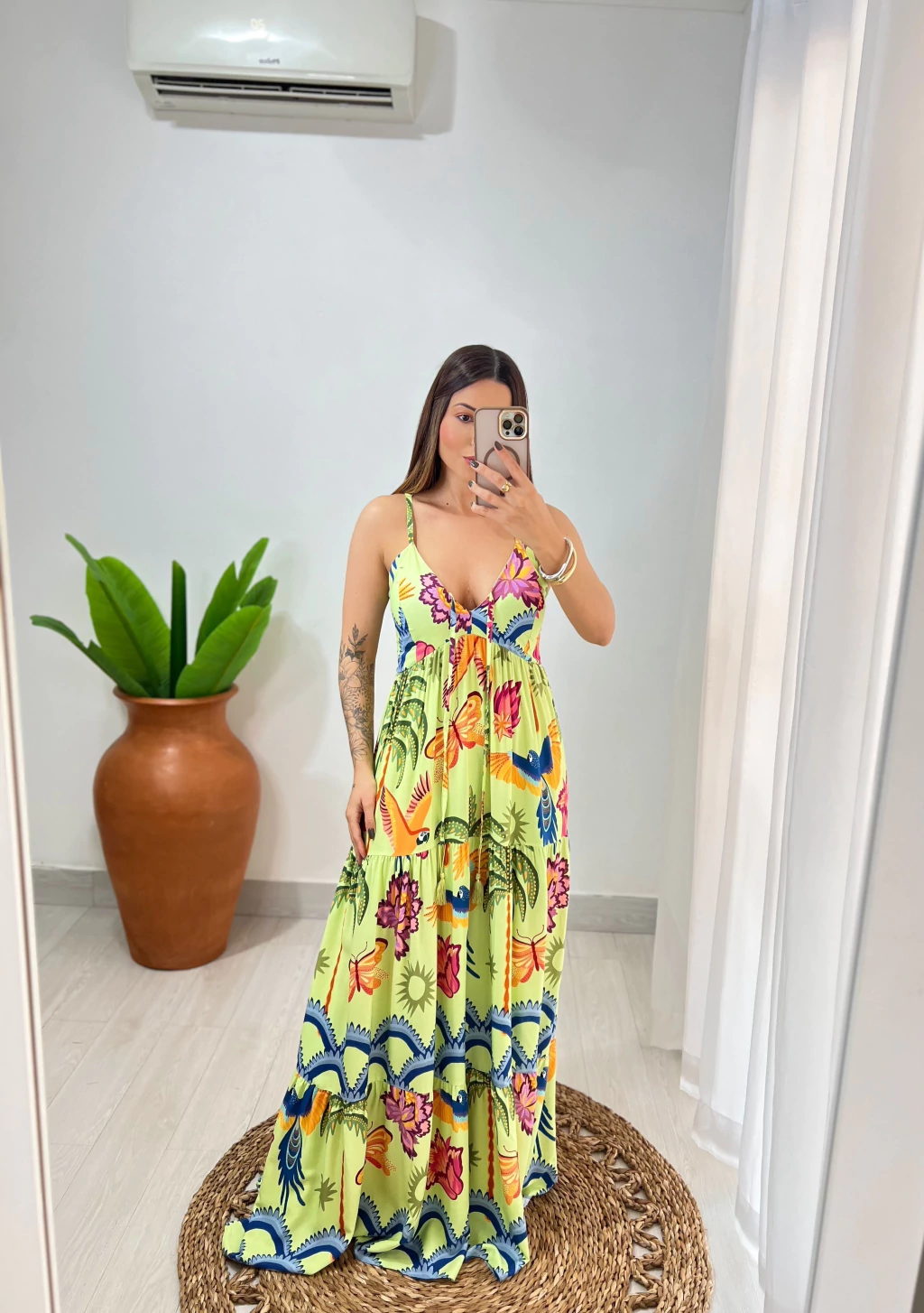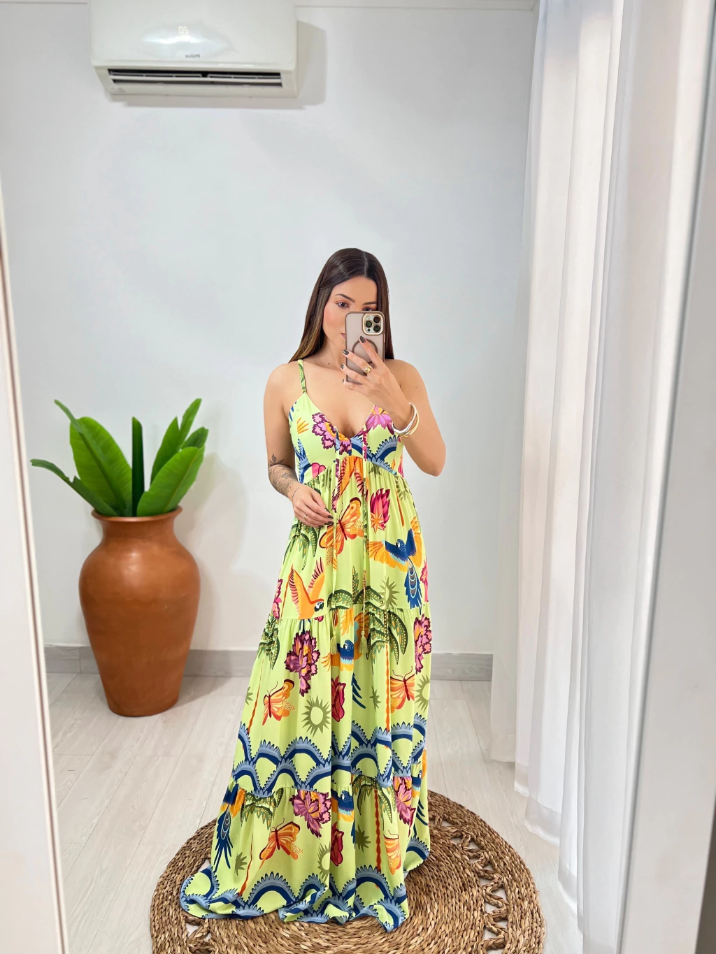 Vestido Marbella – Com estampa vibrante que mistura flores, folhagens e pássaros tropicais, o Vestido Marbella traz frescor e elegância em cada detalhe. Seu modelo longo e fluido, de alcinhas finas, garante movimento e conforto, ideal para dias ensolarados, viagens e ocasiões descontraídas. Um look que traduz leveza, alegria e estilo em uma só peça.