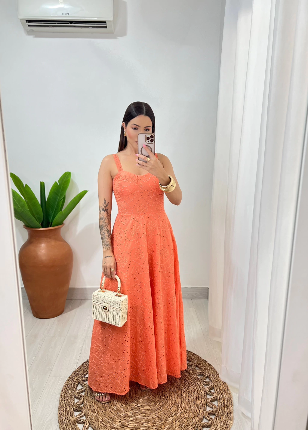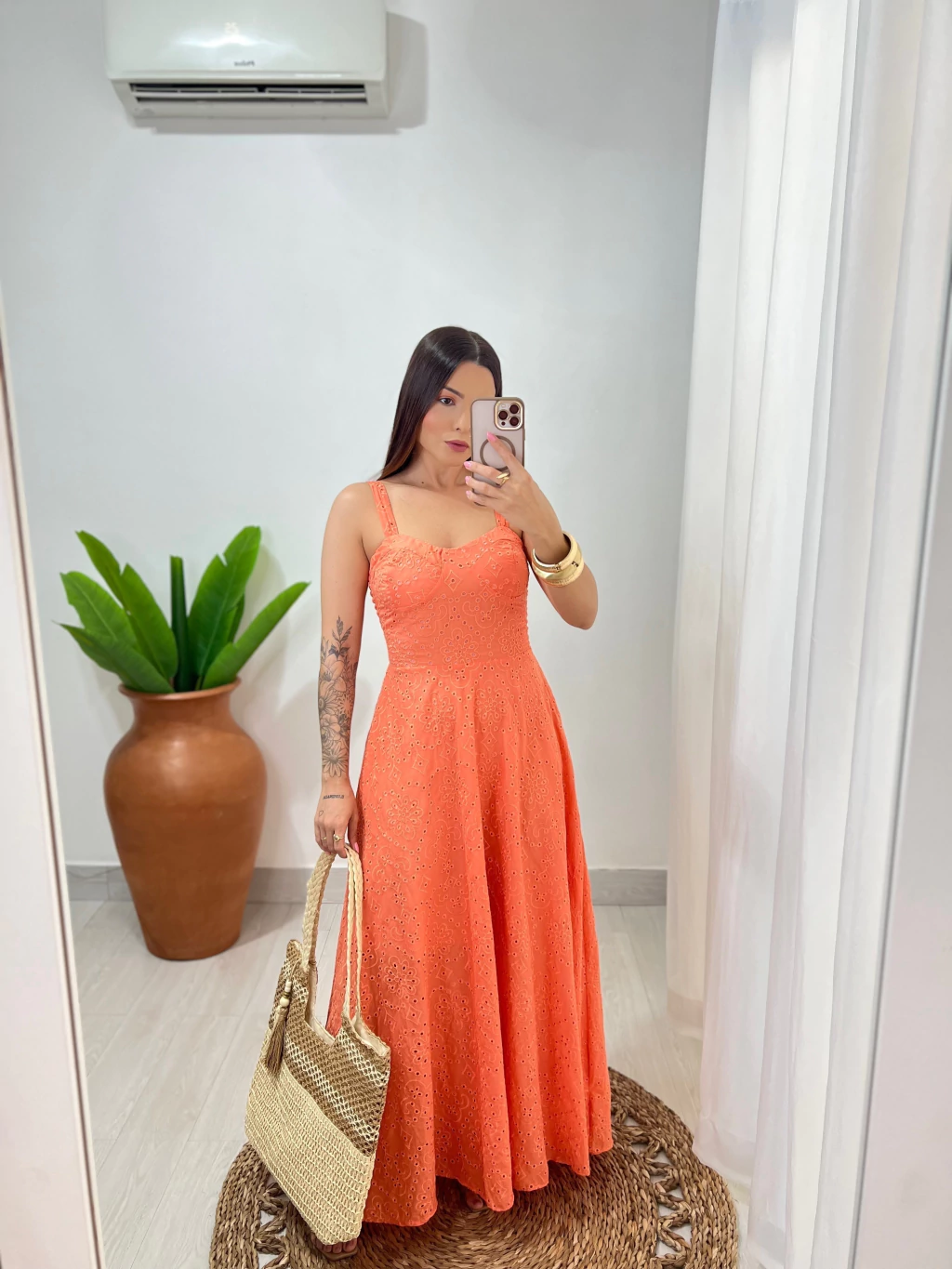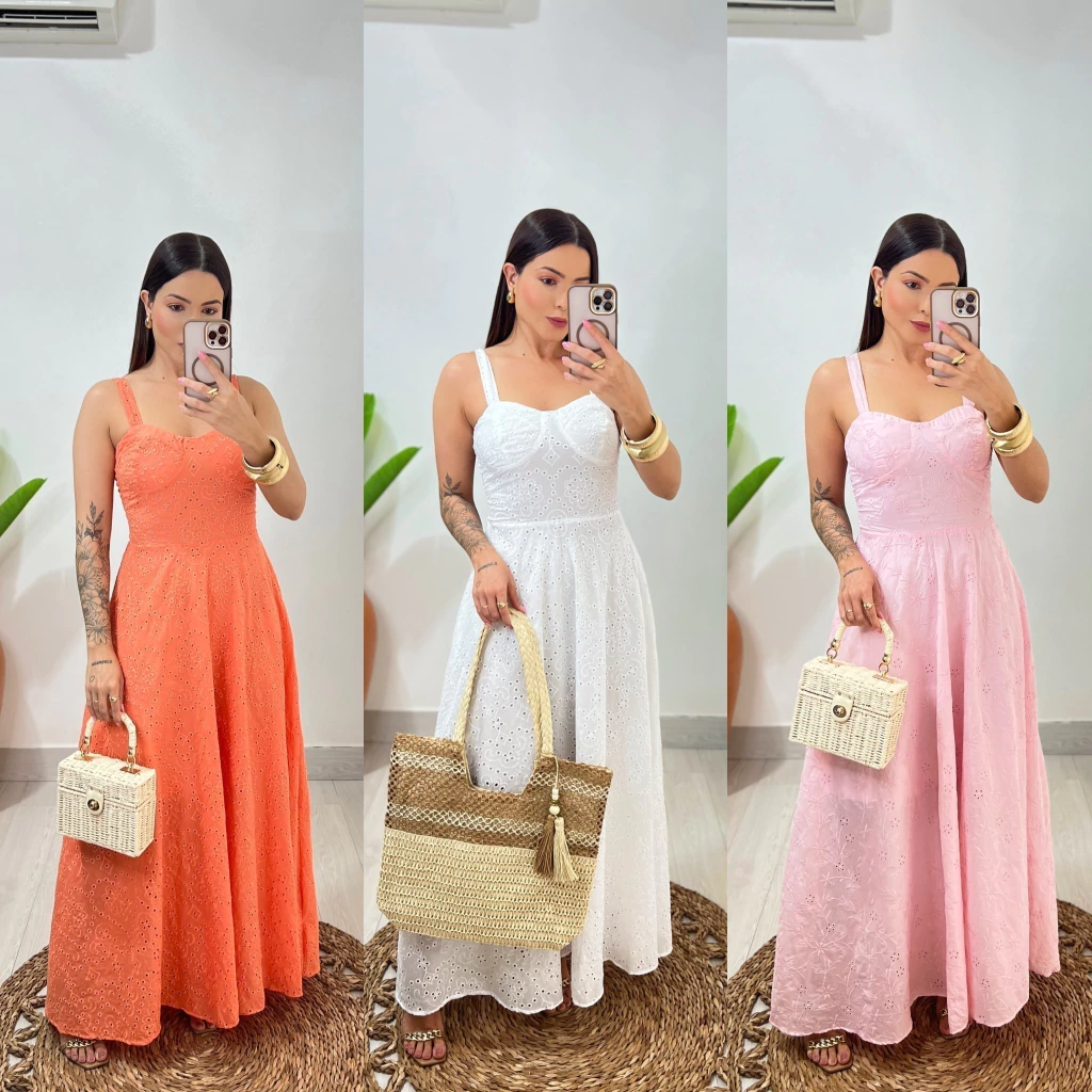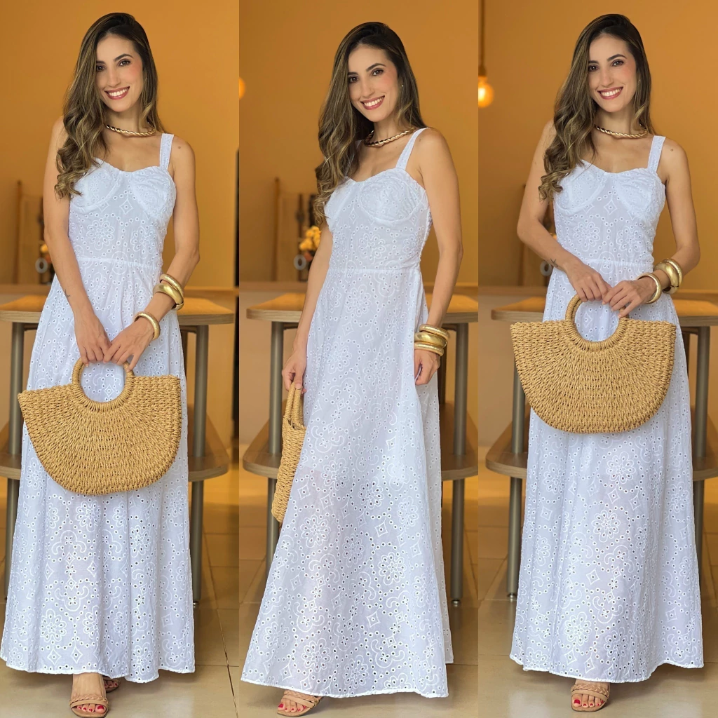 O Vestido Mariela é a escolha perfeita para quem busca leveza, delicadeza e sofisticação em uma só peça. Confeccionado em tecido lese , possui modelagem longa e fluida, alças largas confortáveis e decote estruturado que valoriza o colo.