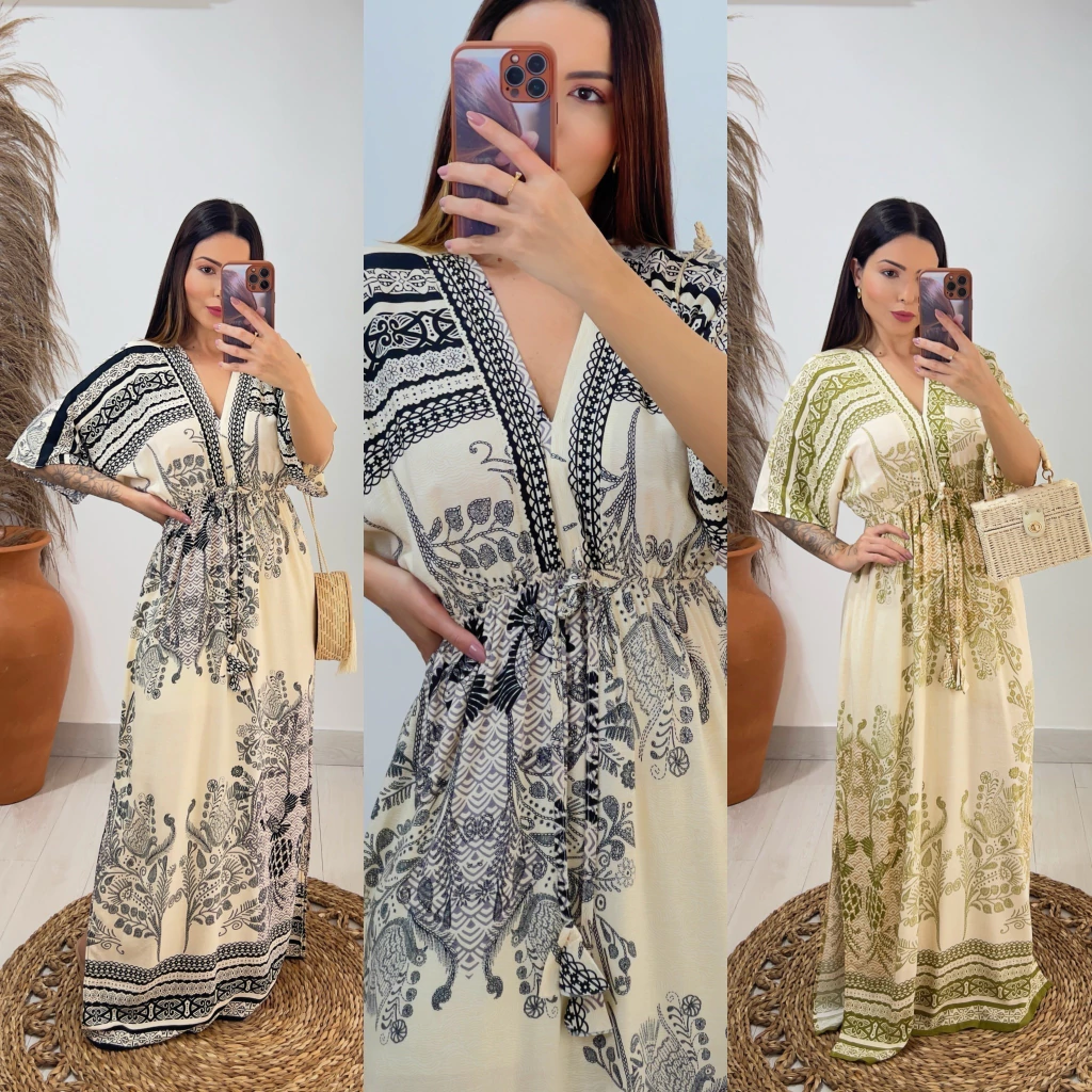 nosso vestido Milena e a escolha perfeita pra você ; com mangas amplas trazendo leveza e conforto; lastex na cintura aderindo ao corpo ; com laço fake ; detalhes de fru-fru nas pontas que dá um charme especial pra peça ; possui forro e leve fendas laterais.