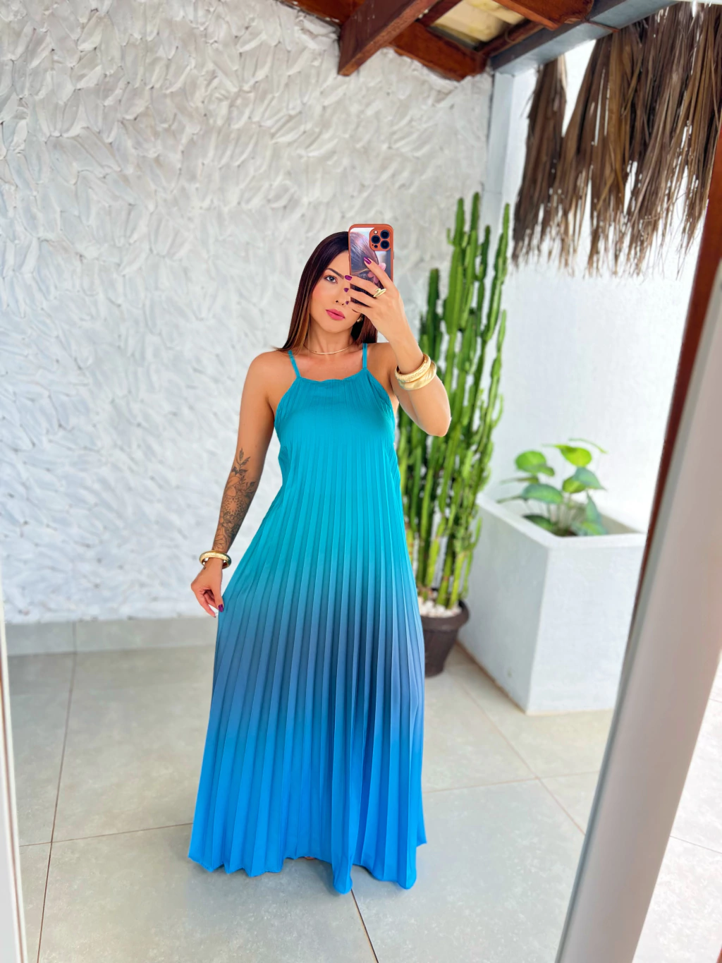 Desperte sua elegância com o Vestido Valéria, confeccionado em tecido crepe plissado que se destaca pela leveza e fluidez. Este modelo versátil possui bojo, proporcionando um caimento perfeito .