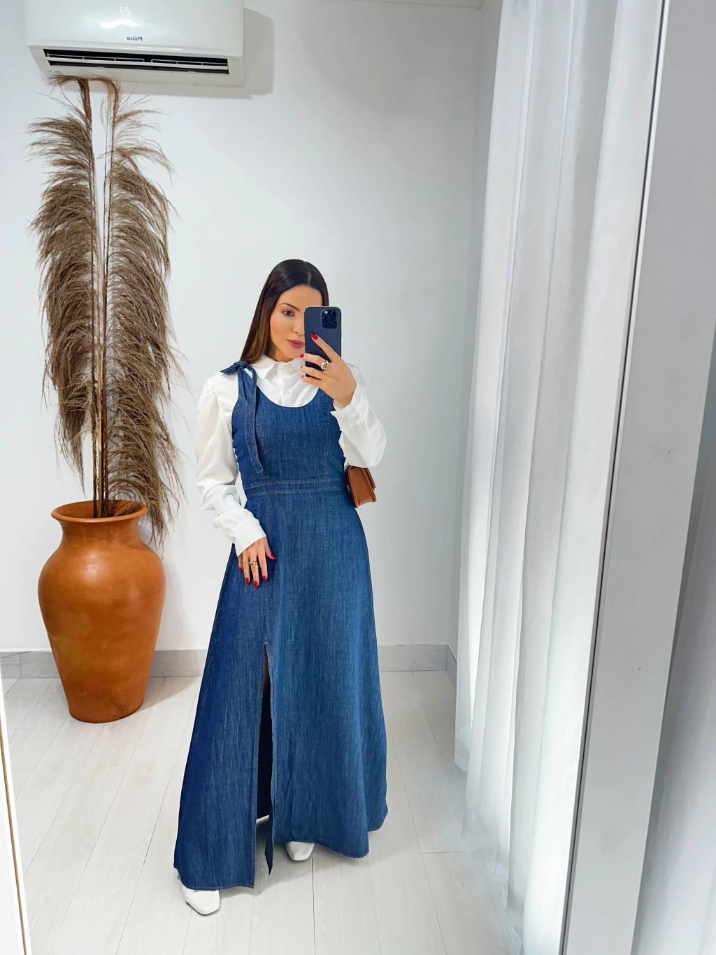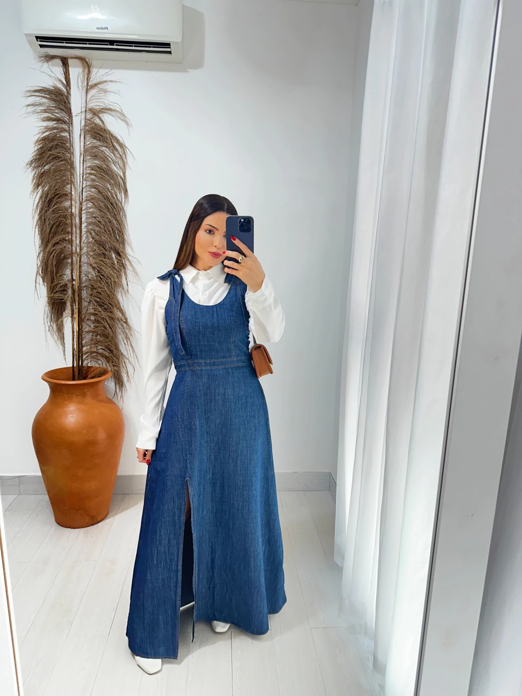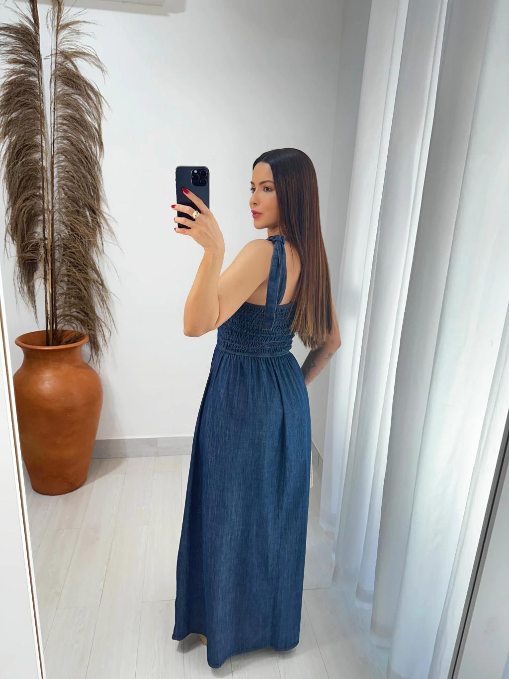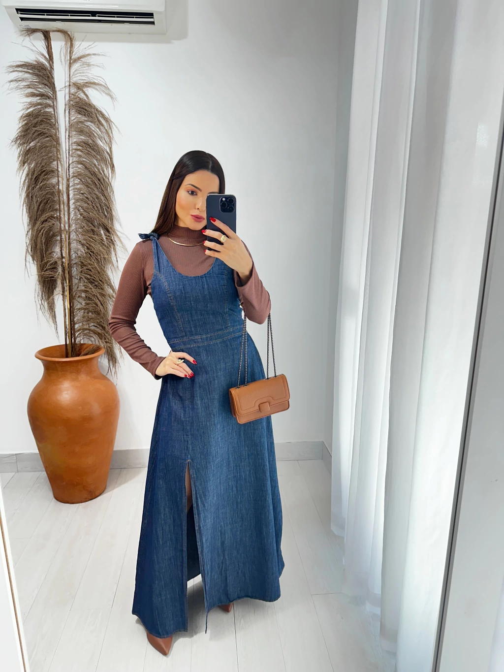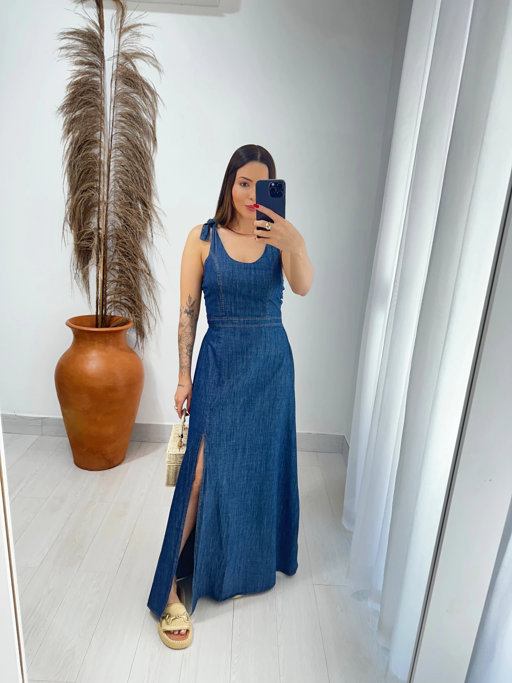 O clássico do jeans repaginado com elegância! Nosso vestido longo Victoria é uma peça versátil e cheia de personalidade. Com modelagem ajustada ao corpo, amarração nos ombros e fenda frontal, ele valoriza a silhueta e traz um toque moderno e feminino. Ideal para usar sozinho nos dias quentes ou sobrepor com blusas de manga longa para um look mais sofisticado. Um curinga que transita do casual ao elegante com facilidade — basta mudar os acessórios!