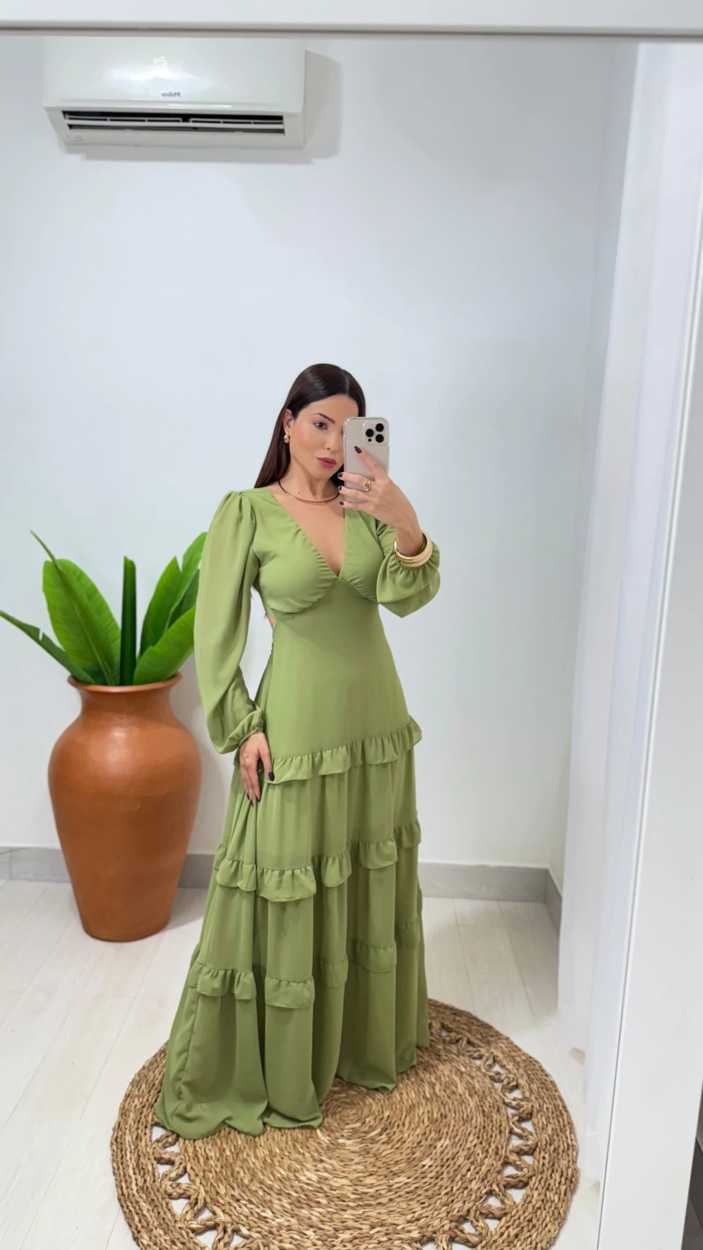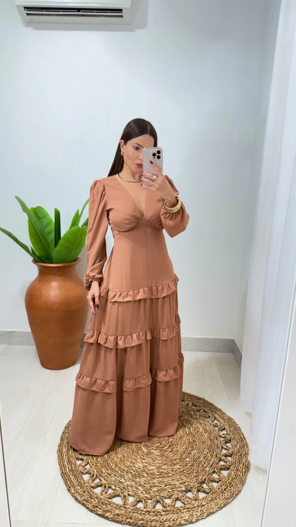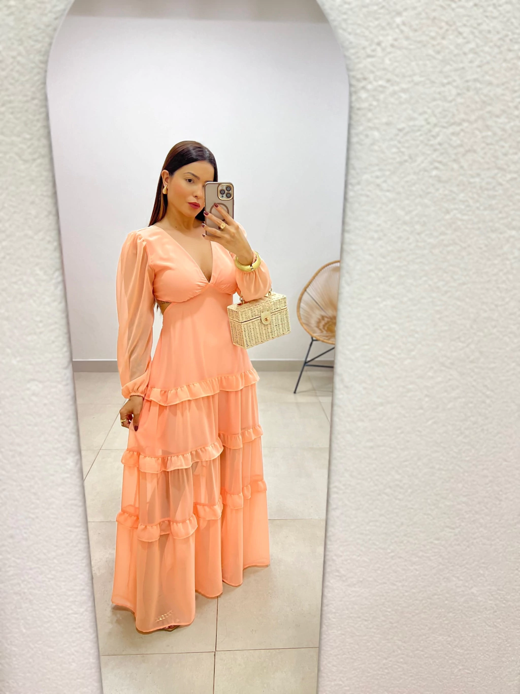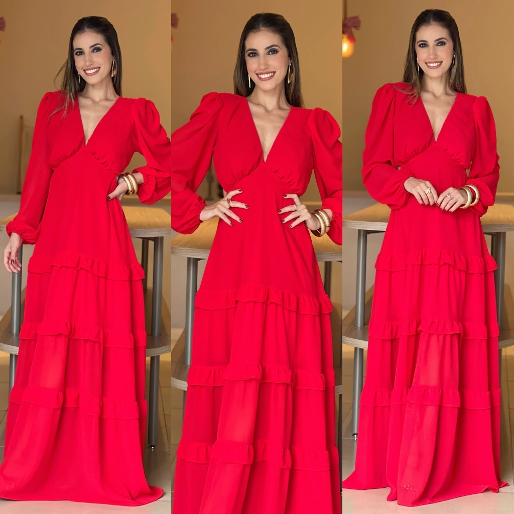 Imaginar-se em um vestido de crepe com manga longa é visualizar elegância e sofisticação. Este vestido é uma escolha perfeita para eventos especiais que exijam um modelo deslumbrante e impecável. Com suas mangas longas e abertura nas laterais, o vestido adiciona um toque de elegância e modernidade ao visual. Além disso, a presença da abertura nas laterais e do decote nas costas tornam este vestido uma escolha perfeita para ocasiões especiais, onde você certamente irá se destacar pela elegância e charme. O decote em V valoriza a região do colo, conferindo uma elegância atemporal, enquanto a amarração nas costas e os detalhes em babados na frente garantem um acabamento refinado e discreto. O tecido crepe proporciona fluidez e leveza ao vestido, resultando em movimento e elegância enquanto se desloca. Este vestido é a escolha perfeita para as mulheres que desejam irradiar beleza, elegância e confiança.