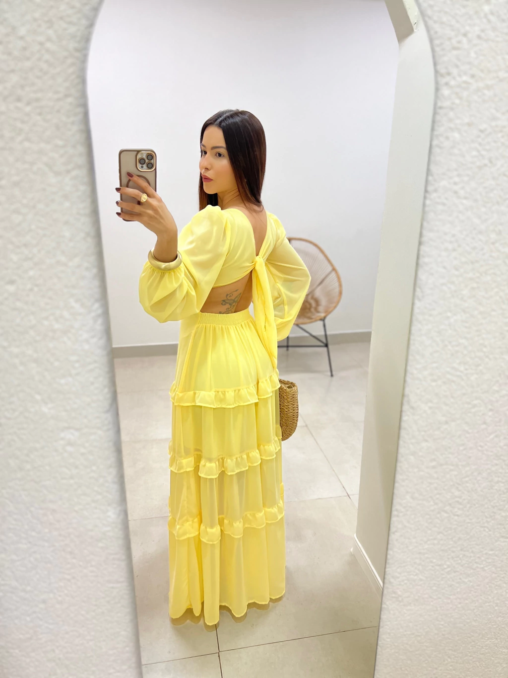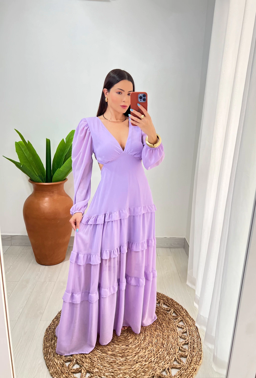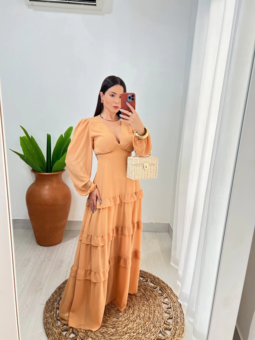 Imaginar-se em um vestido de crepe com manga longa é visualizar elegância e sofisticação. Este vestido é uma escolha perfeita para eventos especiais que exijam um modelo deslumbrante e impecável. Com suas mangas longas e abertura nas laterais, o vestido adiciona um toque de elegância e modernidade ao visual. Além disso, a presença da abertura nas laterais e do decote nas costas tornam este vestido uma escolha perfeita para ocasiões especiais, onde você certamente irá se destacar pela elegância e charme. O decote em V valoriza a região do colo, conferindo uma elegância atemporal, enquanto a amarração nas costas e os detalhes em babados na frente garantem um acabamento refinado e discreto. O tecido crepe proporciona fluidez e leveza ao vestido, resultando em movimento e elegância enquanto se desloca. Este vestido é a escolha perfeita para as mulheres que desejam irradiar beleza, elegância e confiança.