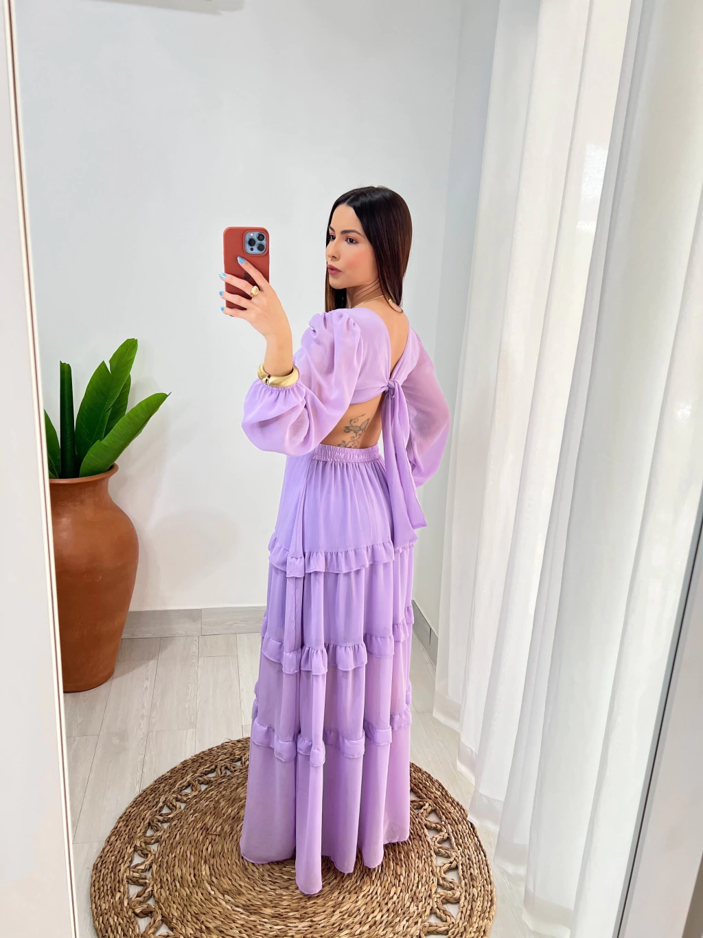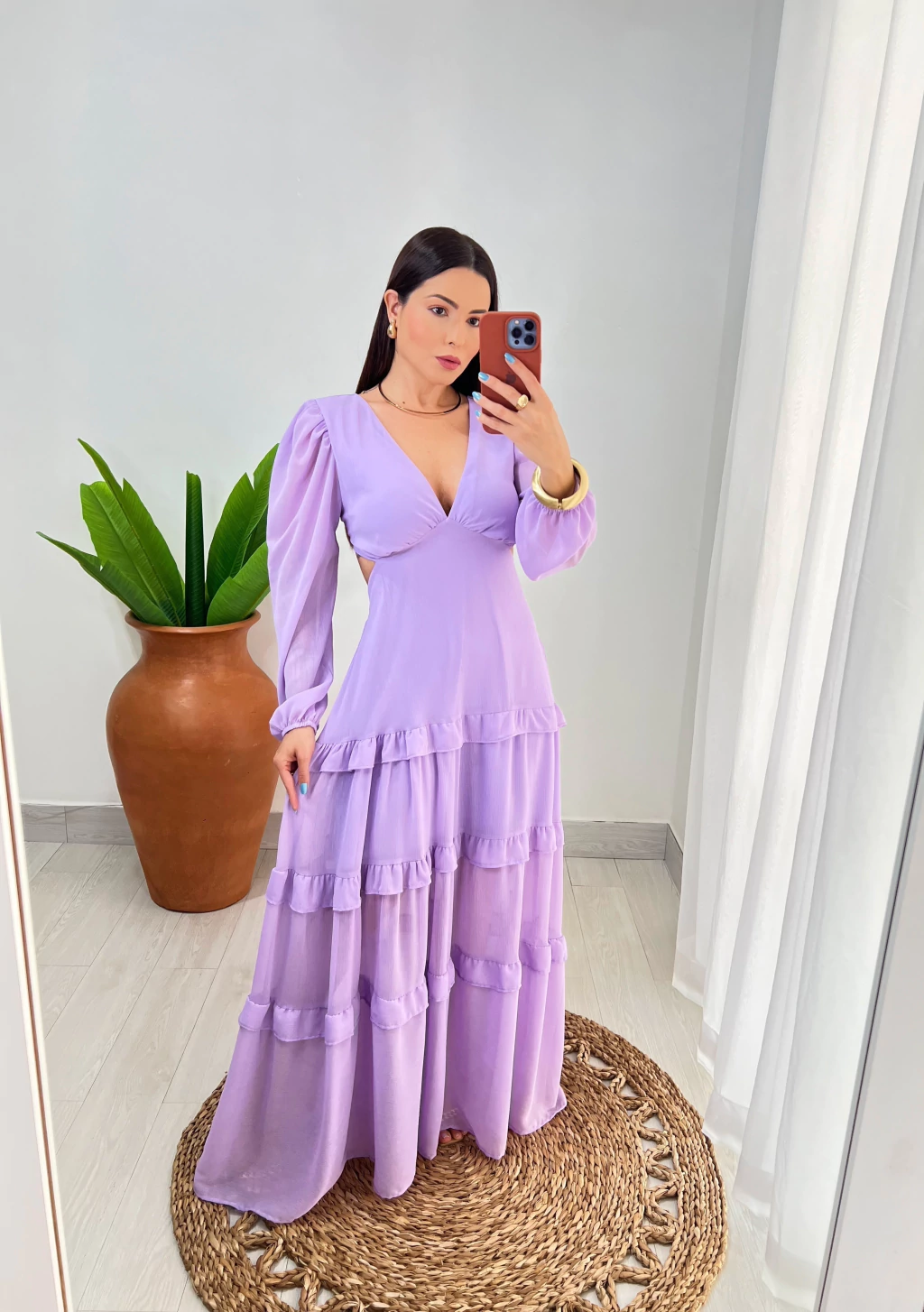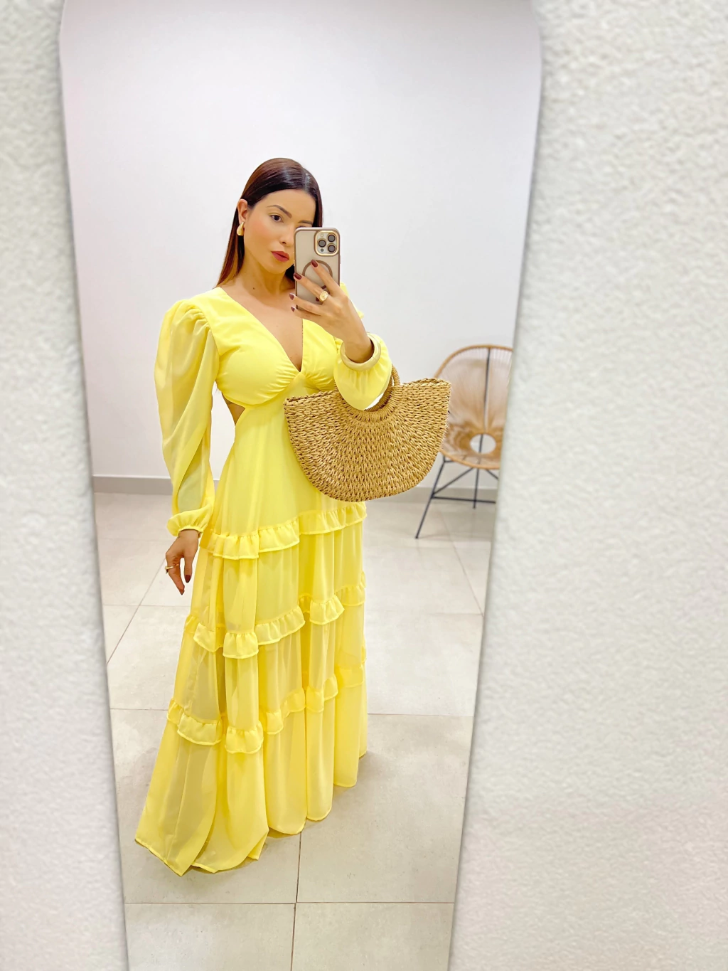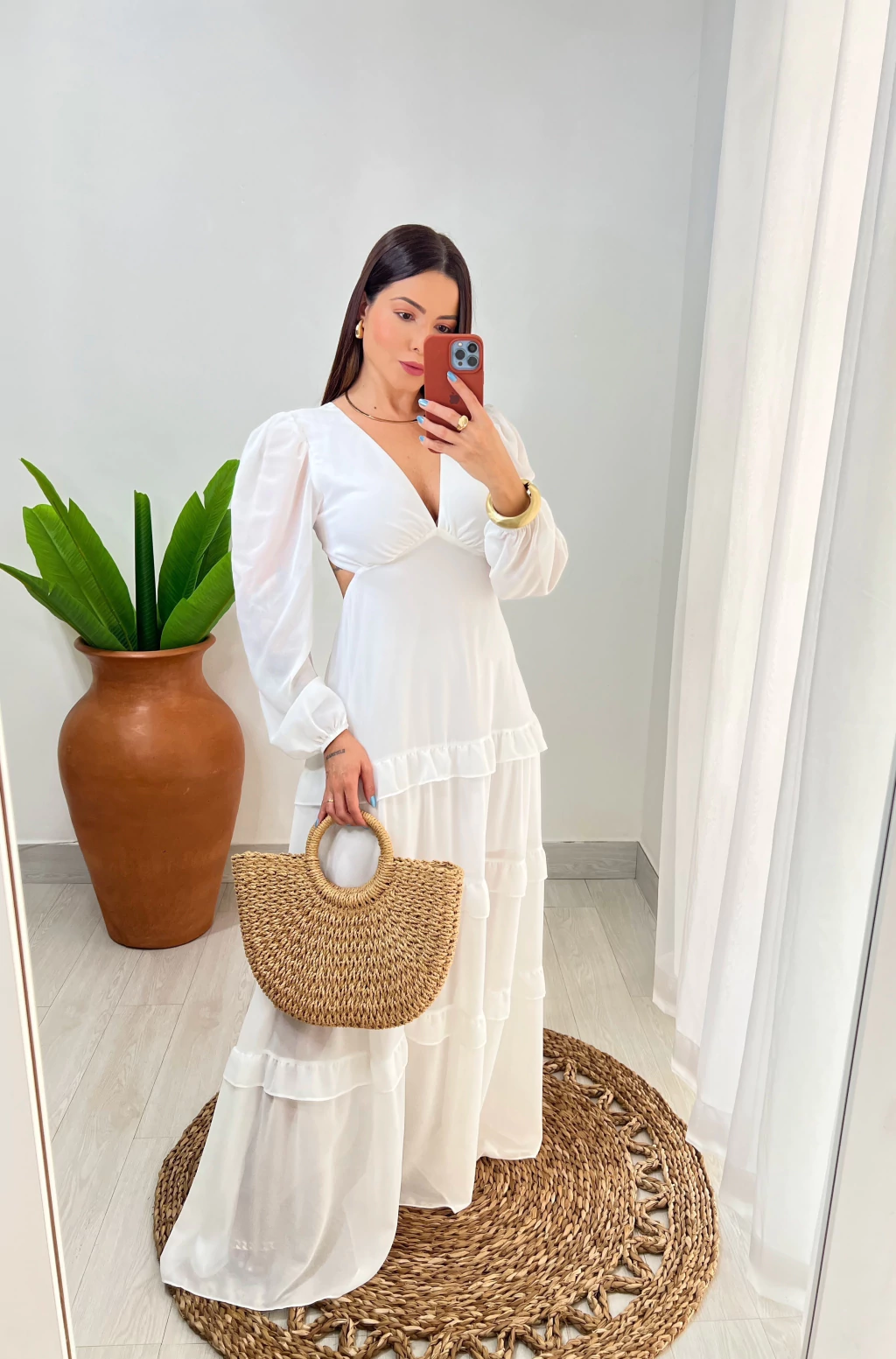 Imaginar-se em um vestido de crepe com manga longa é visualizar elegância e sofisticação. Este vestido é uma escolha perfeita para eventos especiais que exijam um modelo deslumbrante e impecável. Com suas mangas longas e abertura nas laterais, o vestido adiciona um toque de elegância e modernidade ao visual. Além disso, a presença da abertura nas laterais e do decote nas costas tornam este vestido uma escolha perfeita para ocasiões especiais, onde você certamente irá se destacar pela elegância e charme. O decote em V valoriza a região do colo, conferindo uma elegância atemporal, enquanto a amarração nas costas e os detalhes em babados na frente garantem um acabamento refinado e discreto. O tecido crepe proporciona fluidez e leveza ao vestido, resultando em movimento e elegância enquanto se desloca. Este vestido é a escolha perfeita para as mulheres que desejam irradiar beleza, elegância e confiança.